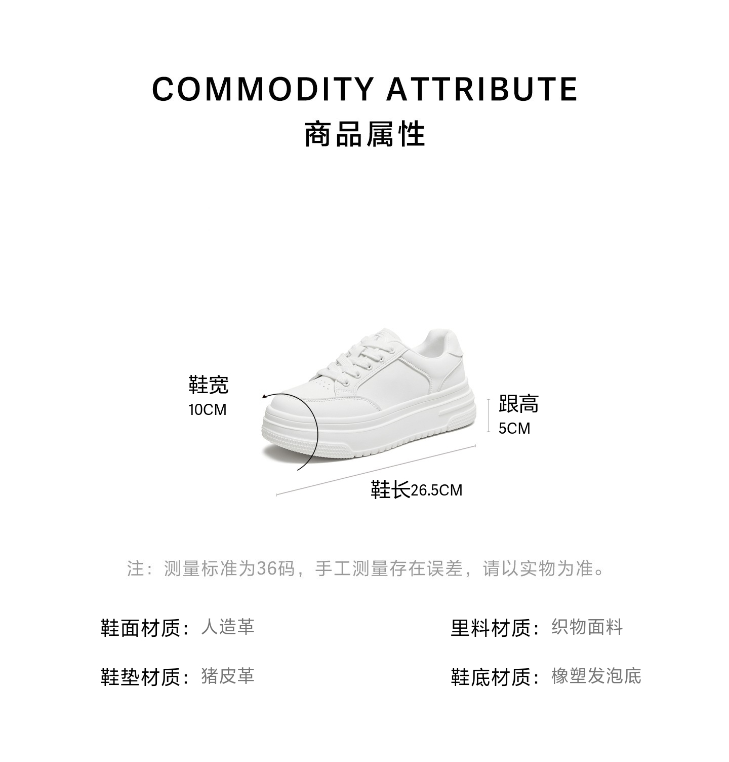 | 色系:白色 | 跟高数值:5CM | 性别:女子 | 里料材质:织物面料 | 制鞋工艺:胶贴皮鞋 |