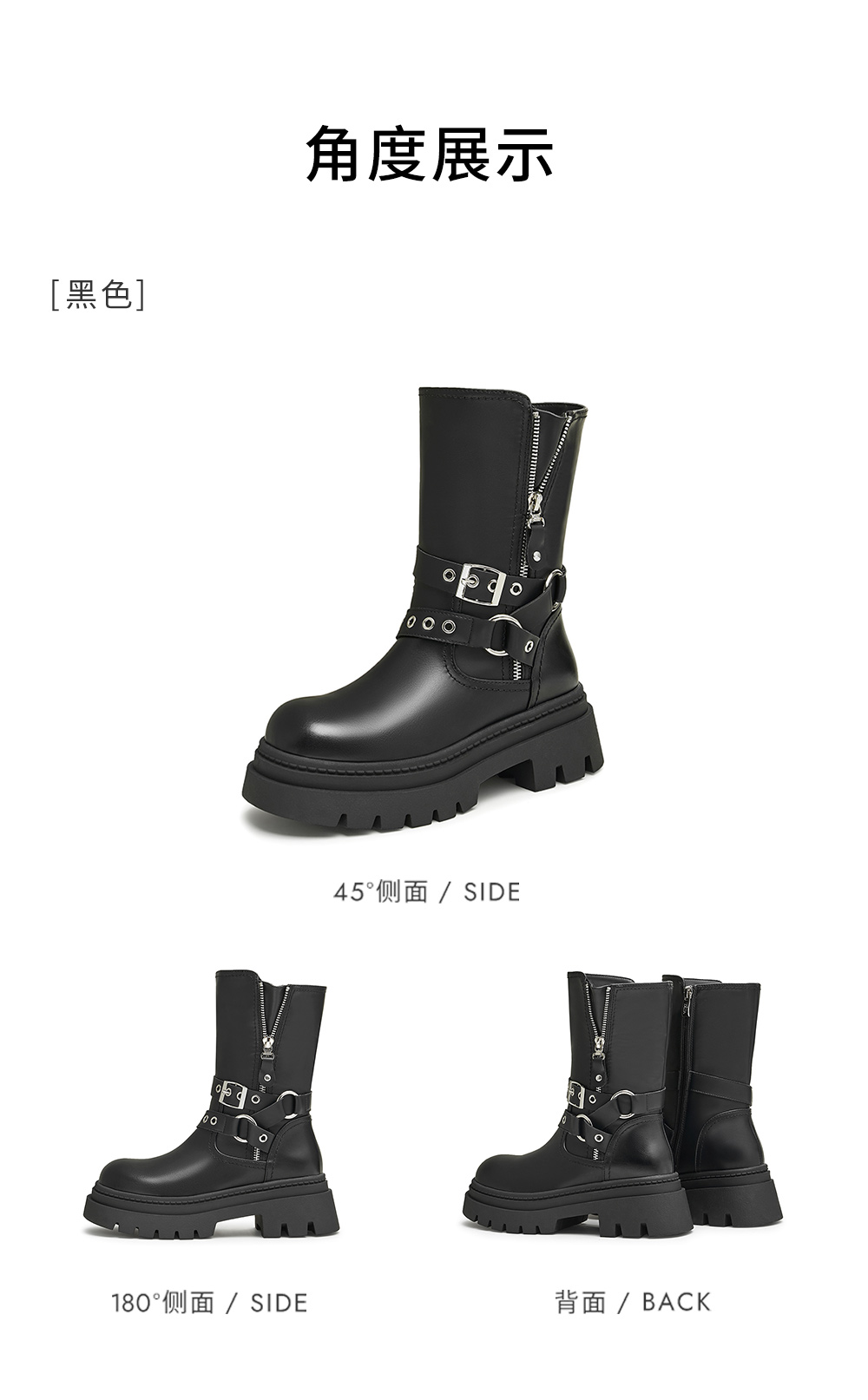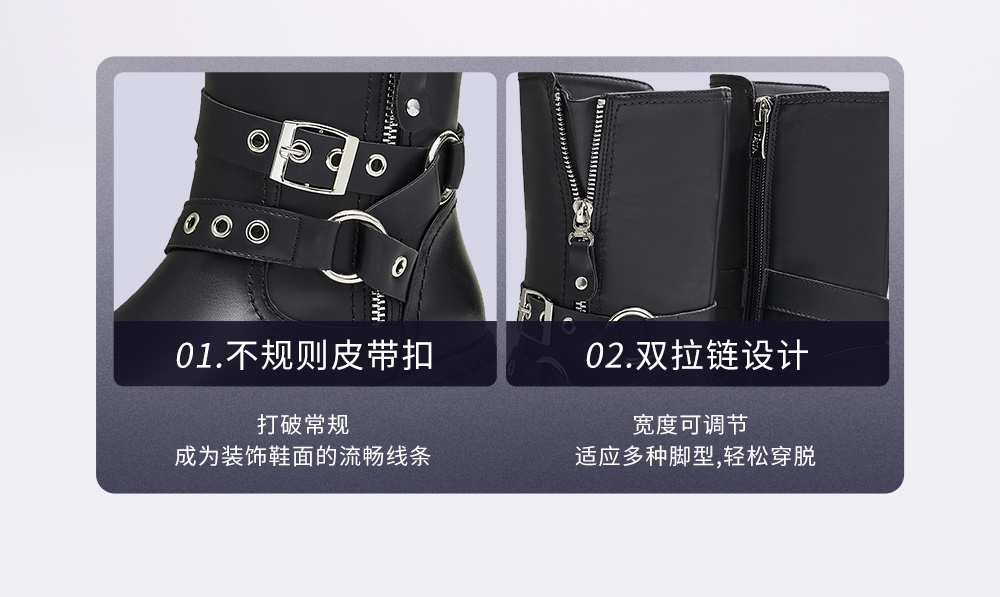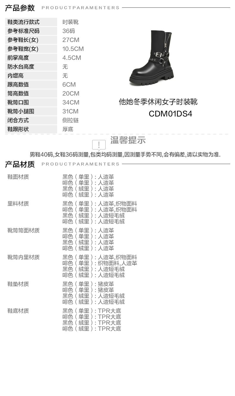 鞋底材质:TPR大底 靴筒内里材质:织物面料人造革 内增高:无 鞋面材质:人造革 闭合方式:侧拉链