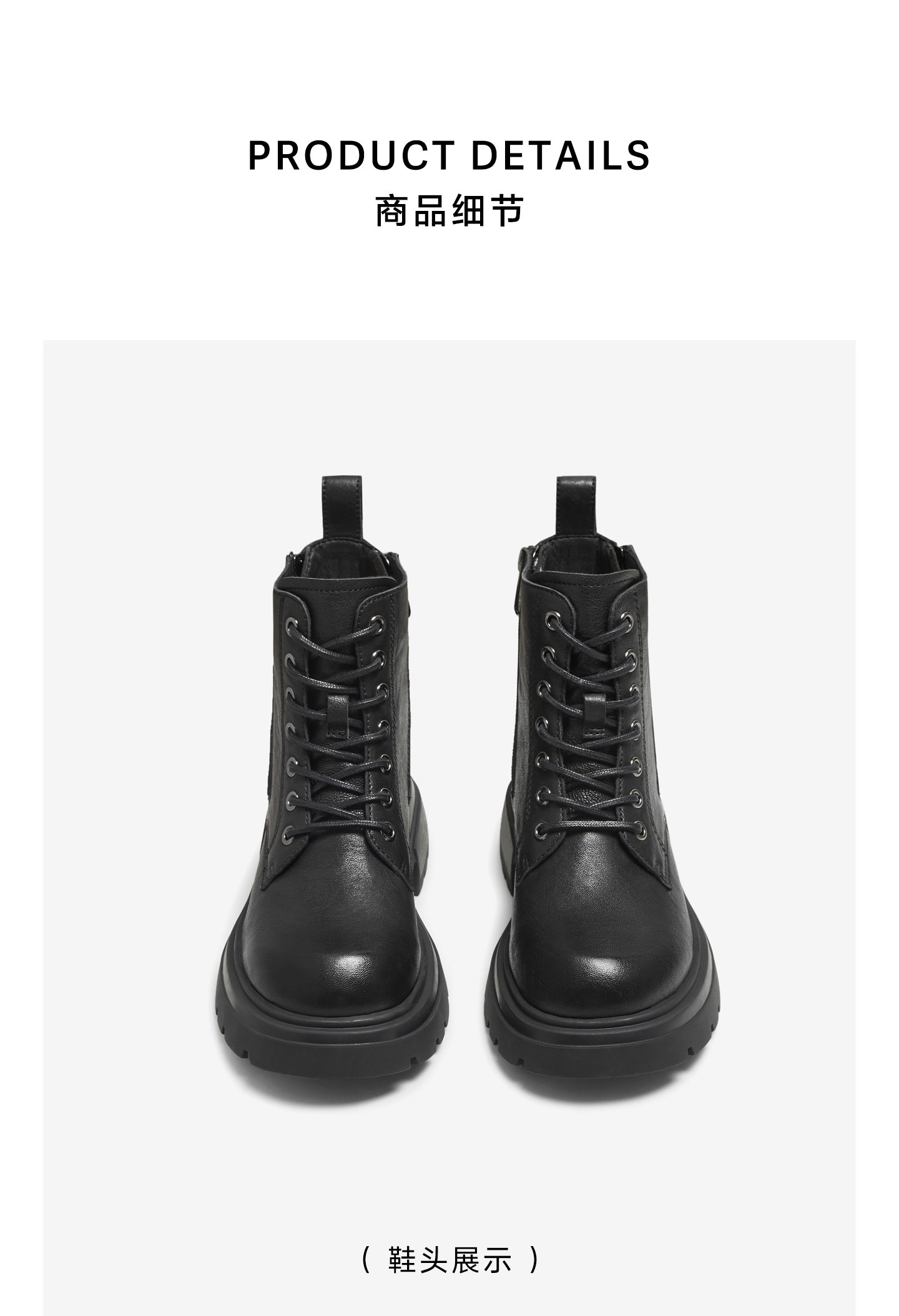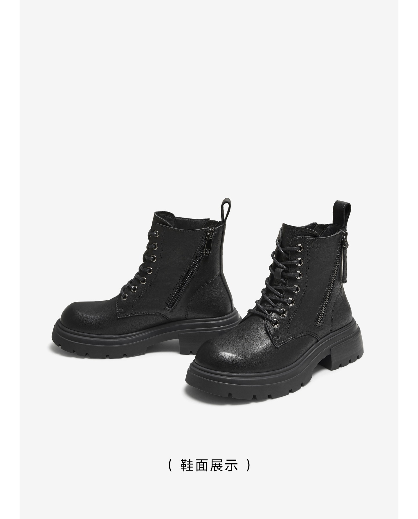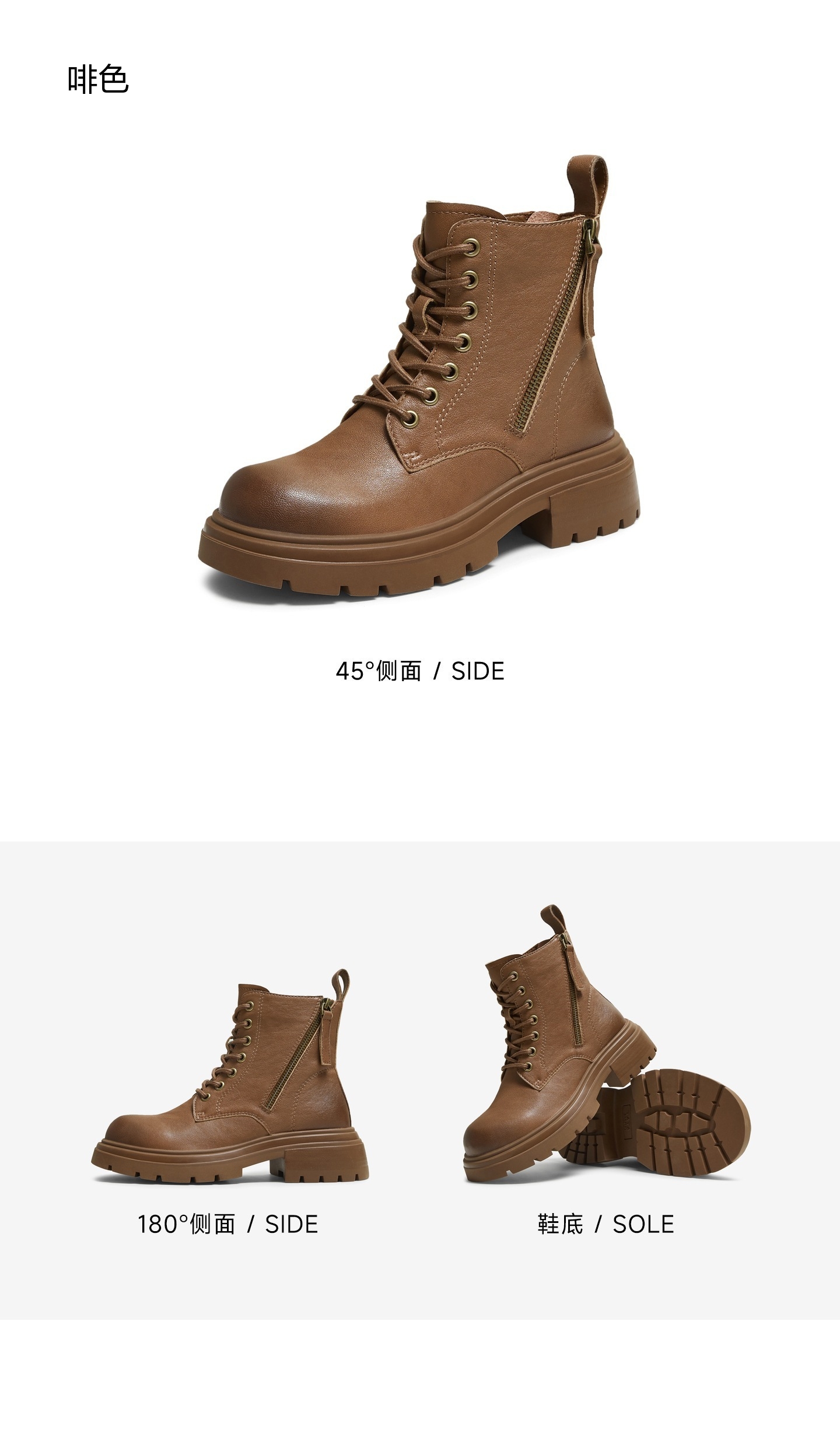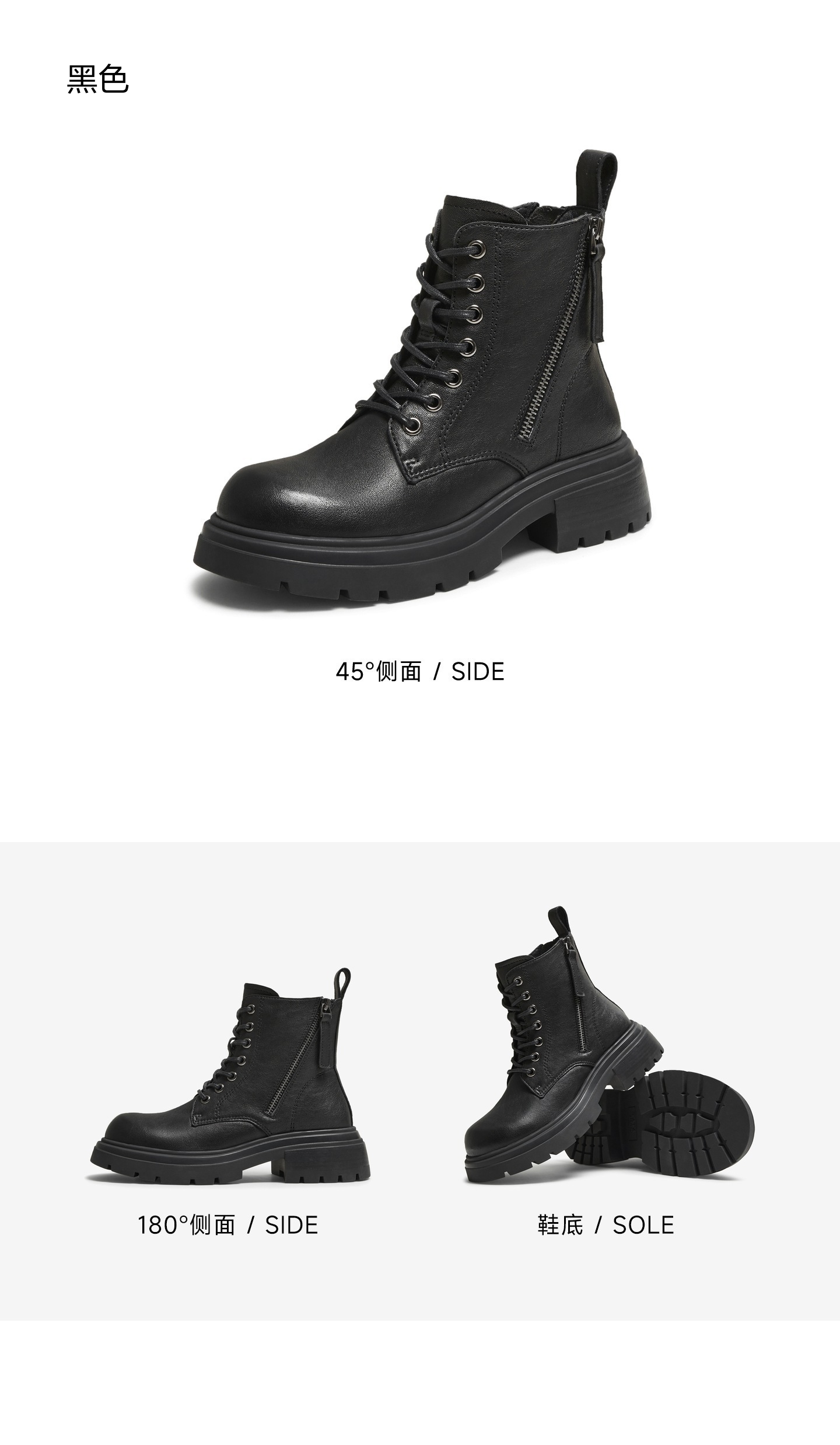 | 鞋底材质:橡胶底 | 靴筒内里材质:PU革织物面料 | 内增高:无 | 鞋面材质:羊皮革 | 闭合方式:系带侧拉链 |