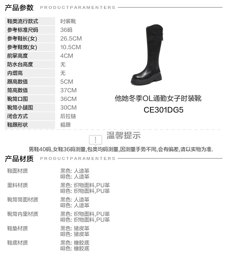 | 风格:OL通勤 | 色系:黑色 | 跟高数值:5CM | 性别:女子 | 筒高数值:37CM |