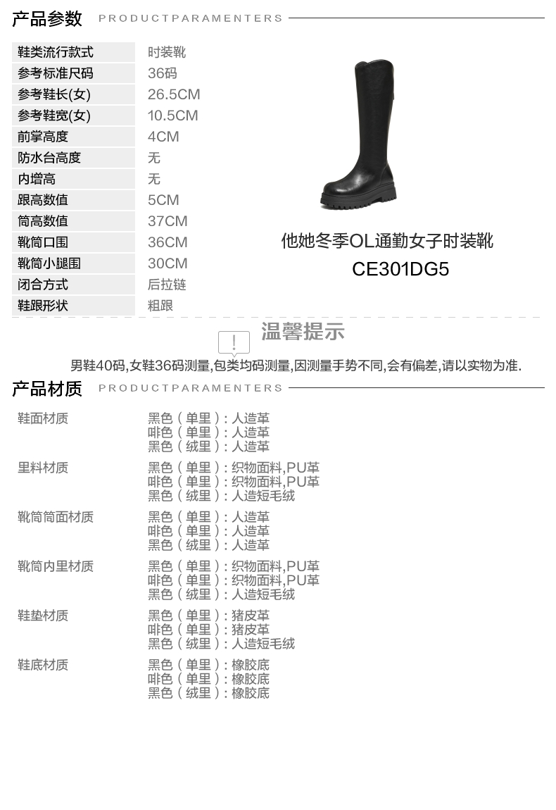 | 风格:OL通勤 | 色系:黑色 | 跟高数值:5CM | 性别:女子 | 筒高数值:37CM |
