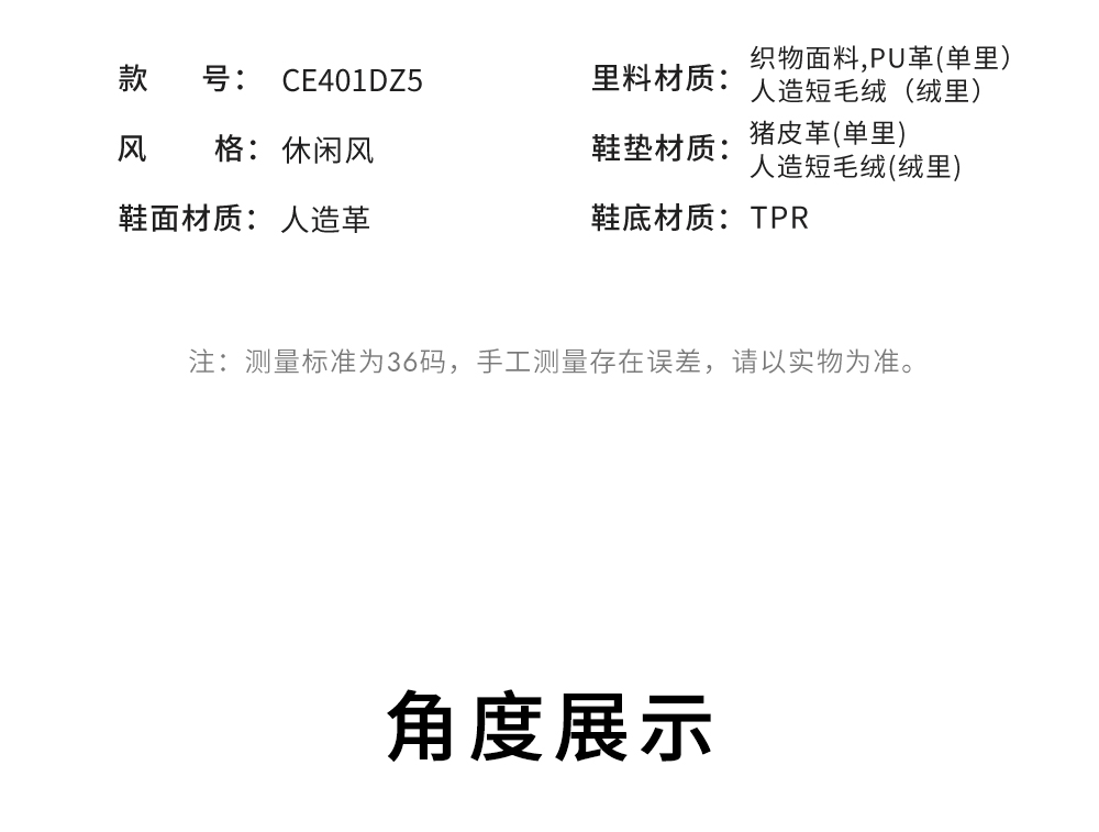 | 靴筒筒面材质:人造革 | 里料材质:人造短毛绒 | 制鞋工艺:胶贴皮鞋 | 鞋垫材质:人造短毛绒 | 款式季节:冬季 |