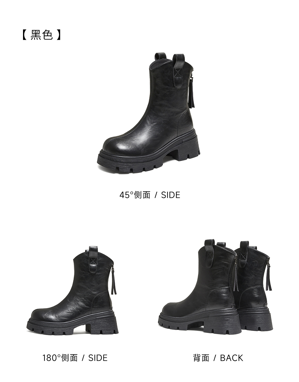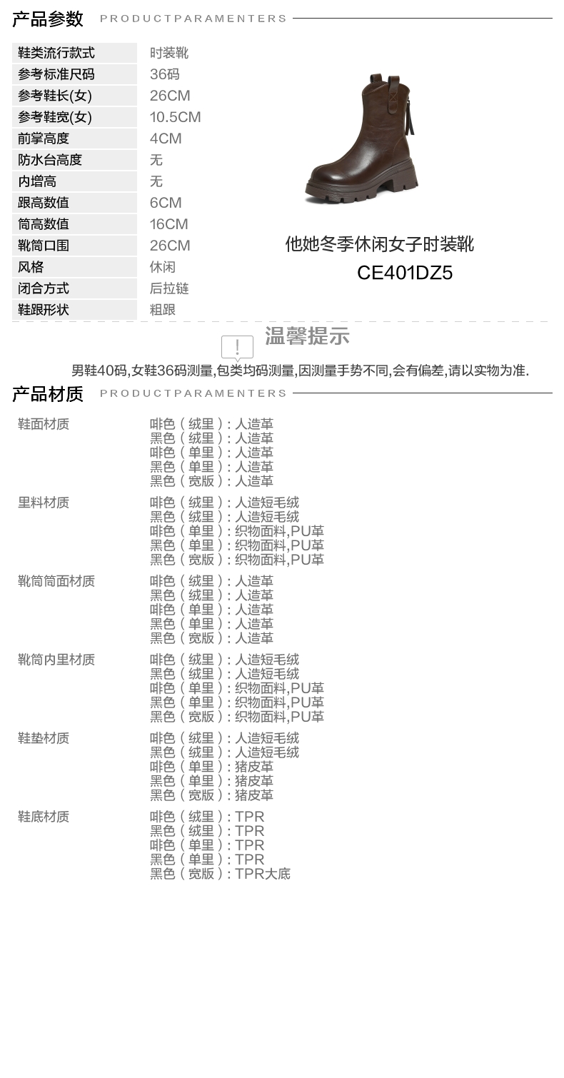 | 鞋底材质:TPR | 靴筒内里材质:人造短毛绒 | 内增高:无 | 鞋面材质:人造革 | 闭合方式:后拉链 |