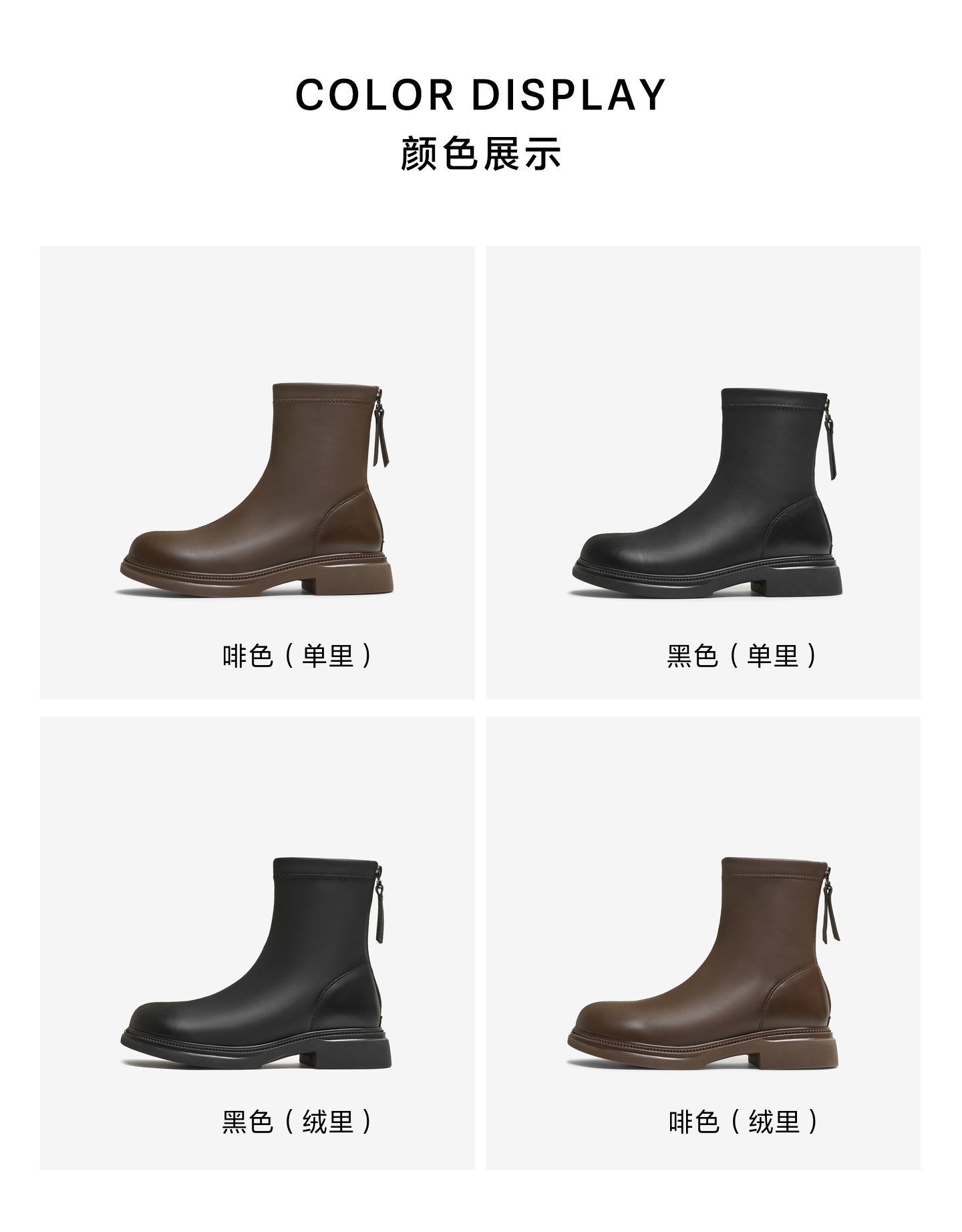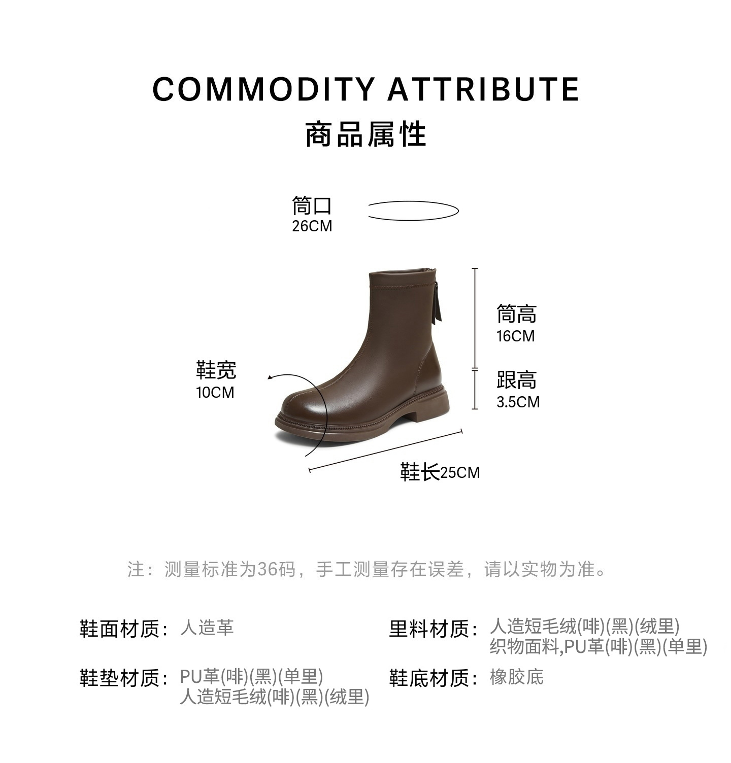 | 鞋底材质:橡胶底 | 靴筒内里材质:PU革织物面料 | 内增高:无 | 鞋面材质:人造革 | 闭合方式:后拉链 |