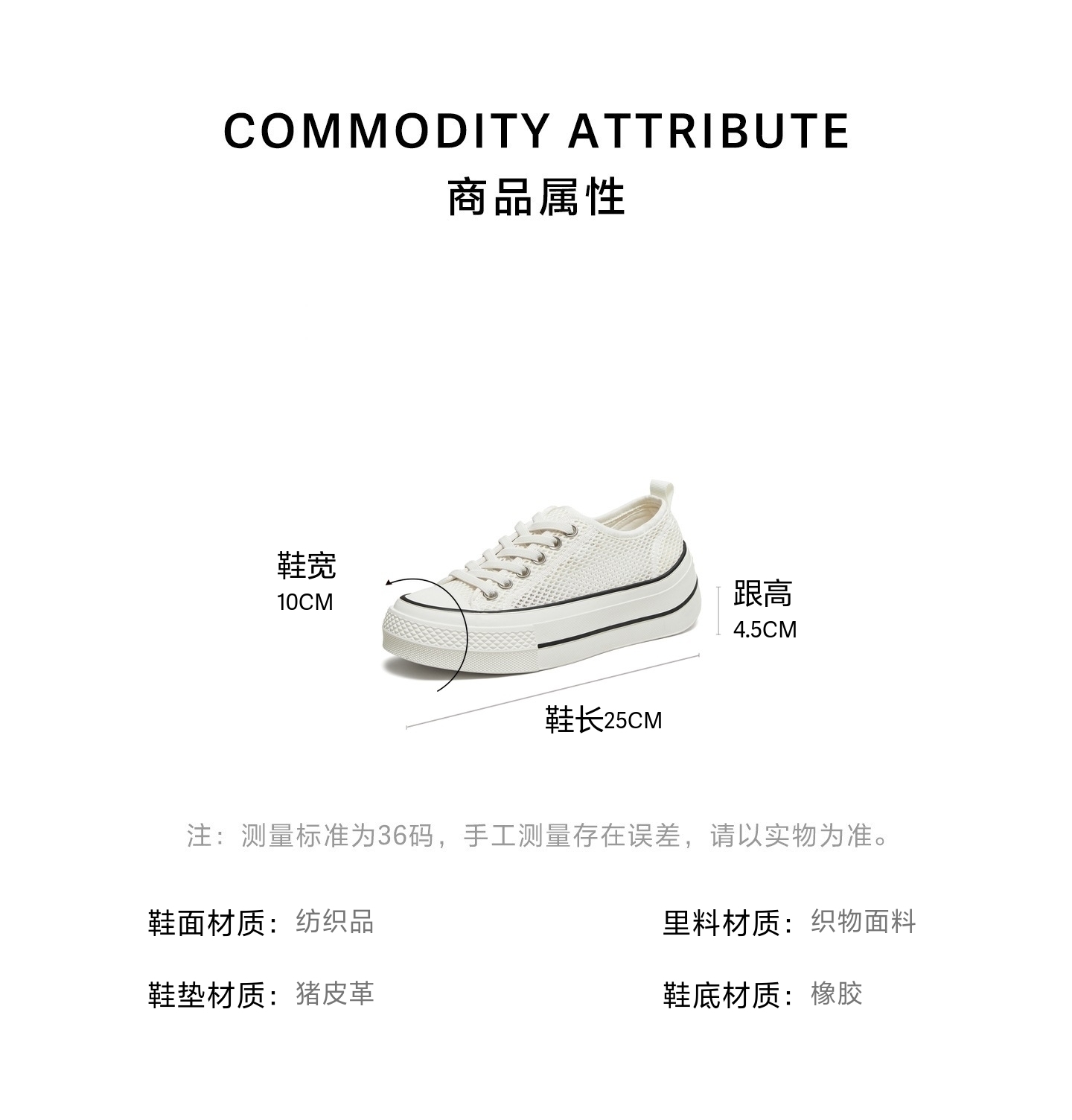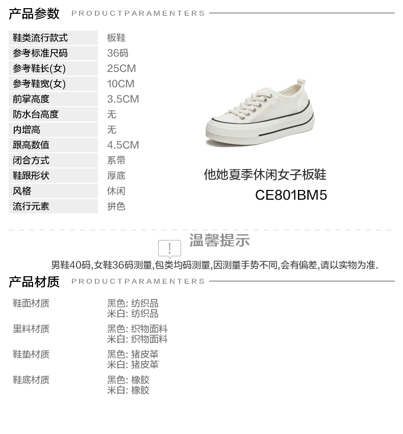 | 鞋跟形状:厚底 | 参考鞋长(女):25CM | 流行元素:拼色 | 参考鞋宽(女):10CM | 风格:休闲 |