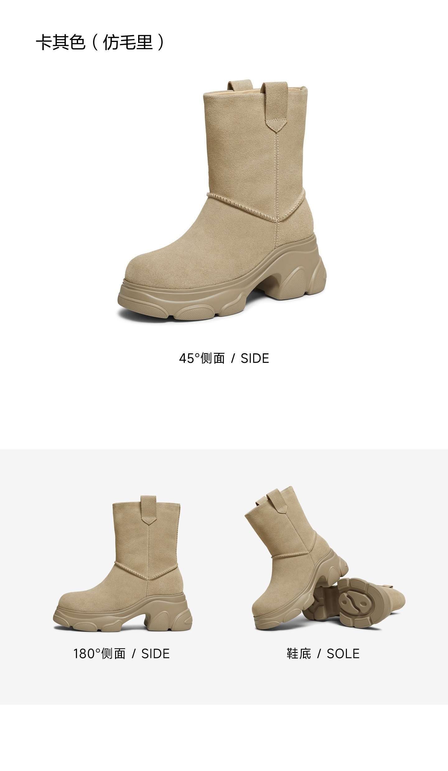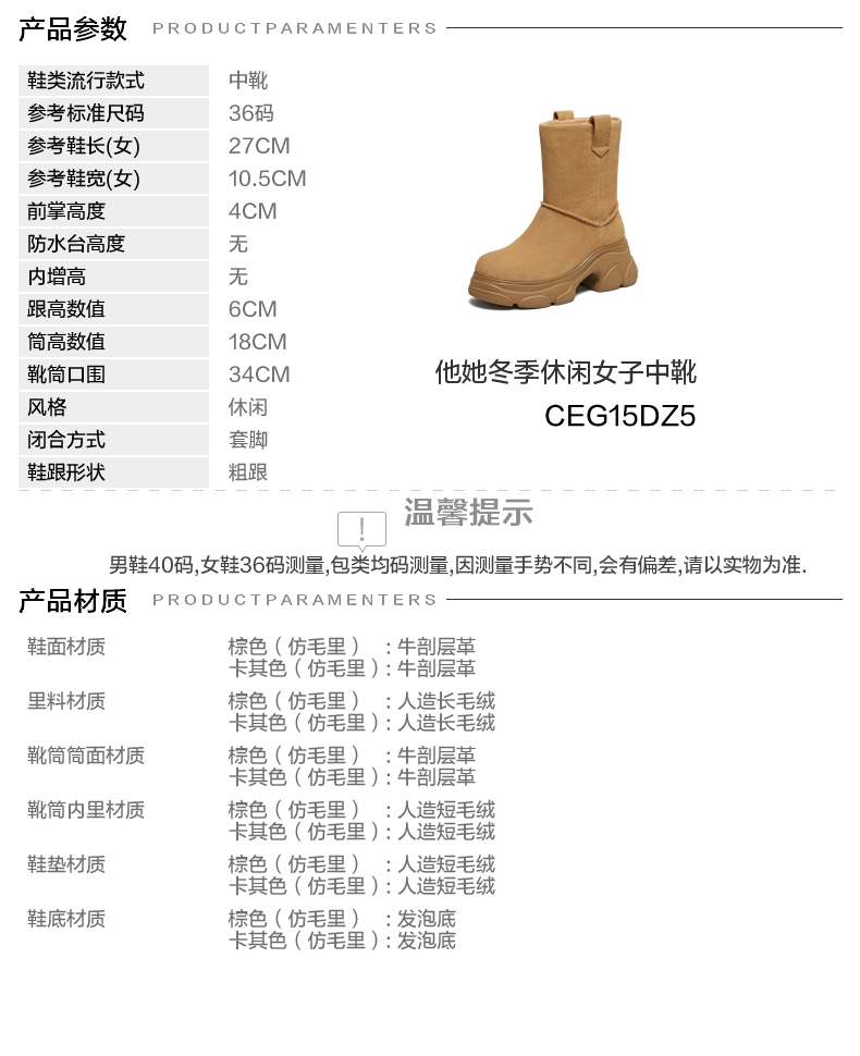 | 靴筒筒面材质:牛剖层革 | 里料材质:人造长毛绒 | 制鞋工艺:胶贴皮鞋 | 鞋垫材质:人造短毛绒 | 款式季节:冬季 |