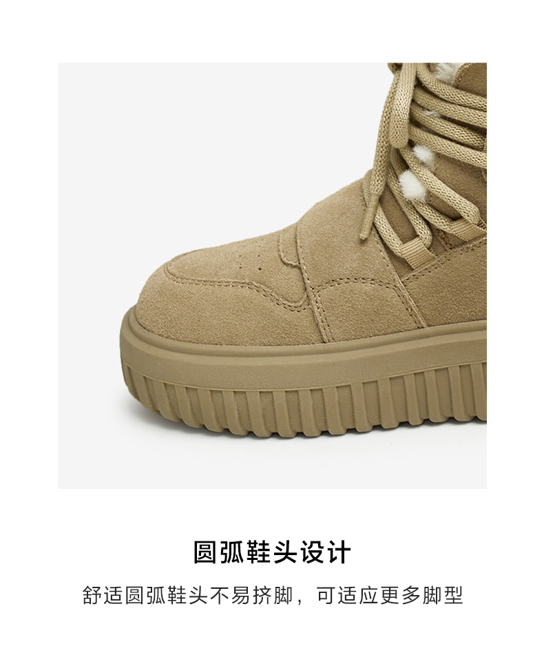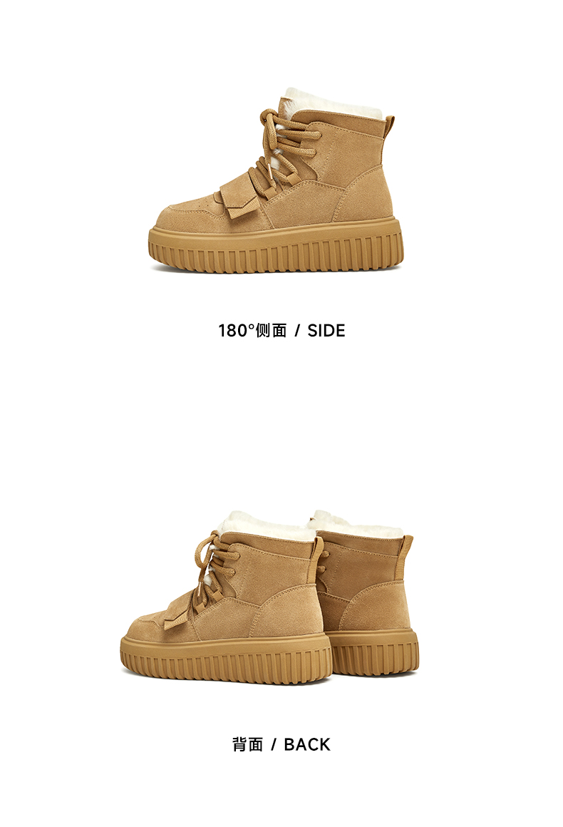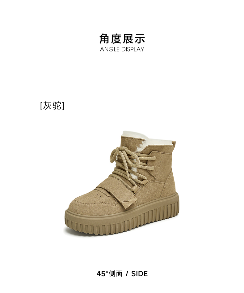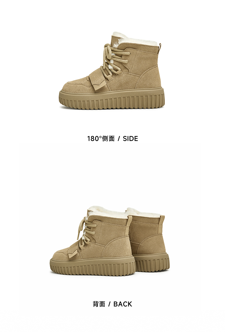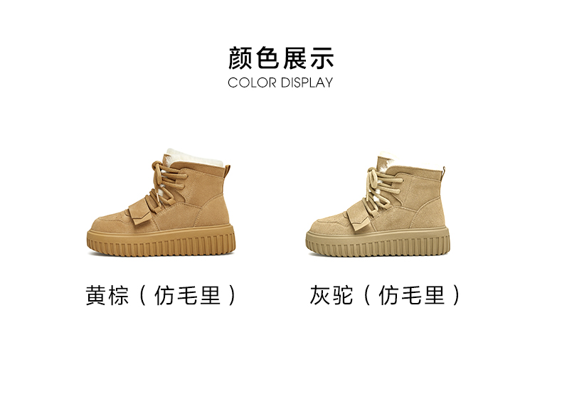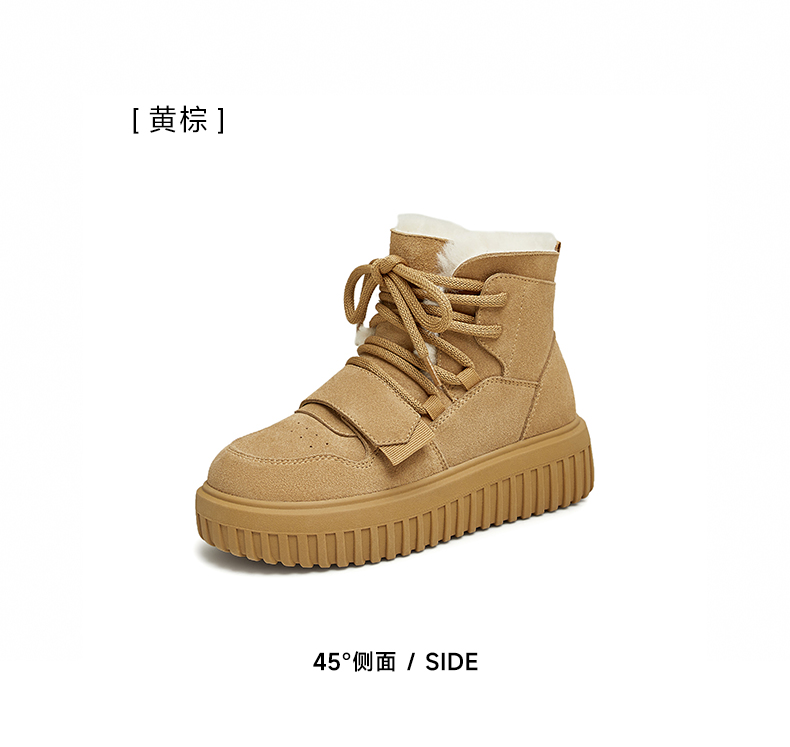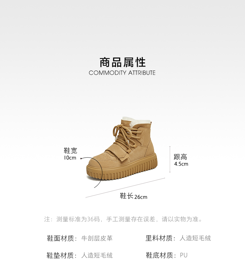 | 鞋底材质:PU | 靴筒内里材质:人造短毛绒 | 内增高:无 | 鞋面材质:牛剖层皮革 | 闭合方式:魔术贴系带 |