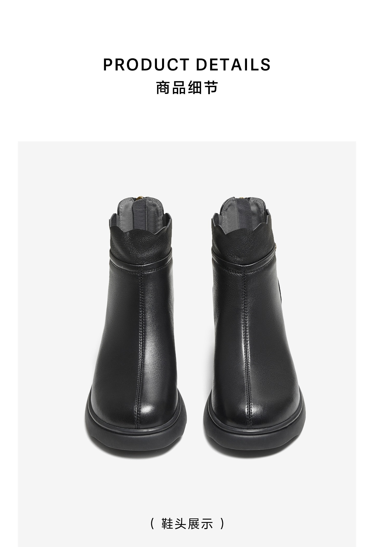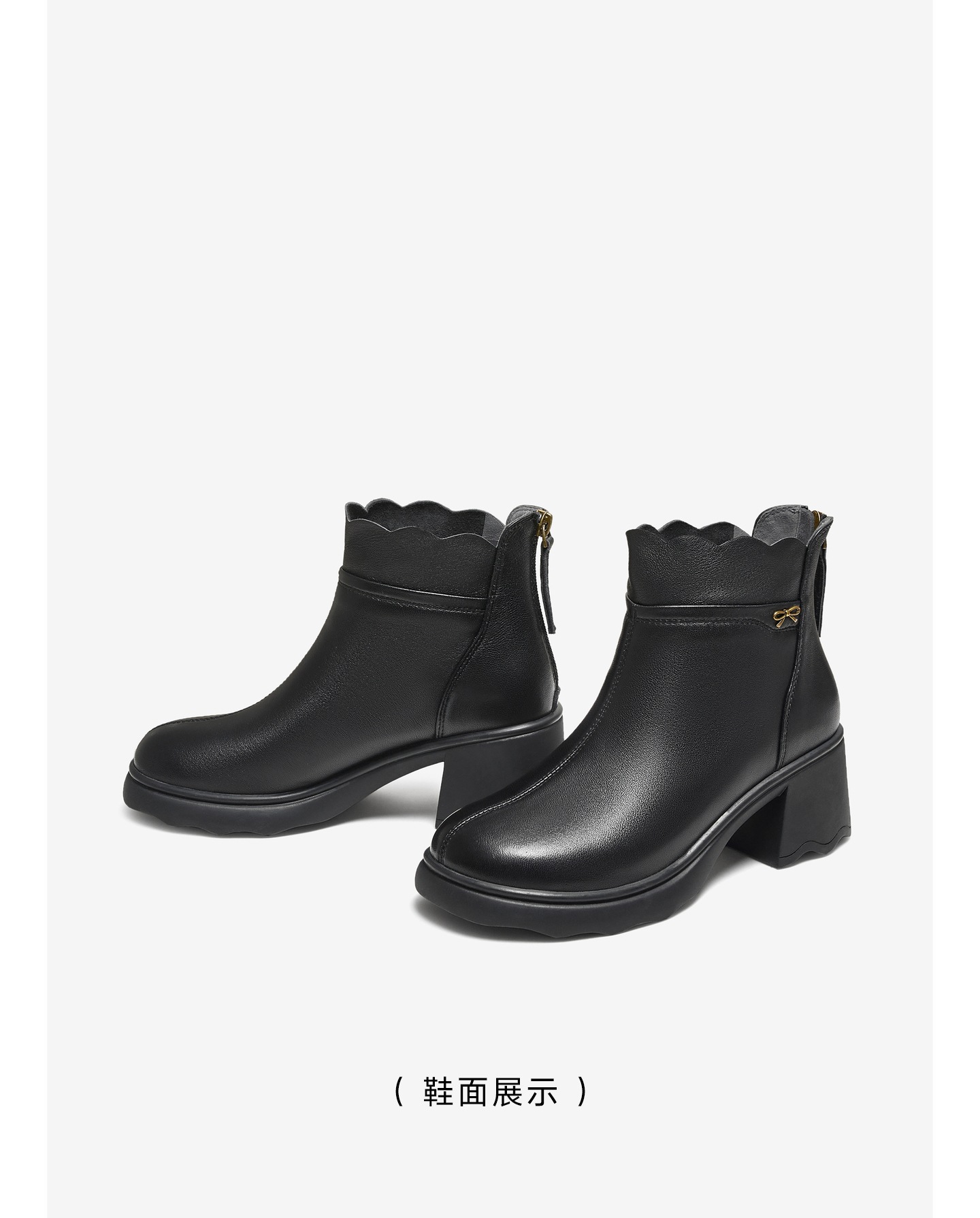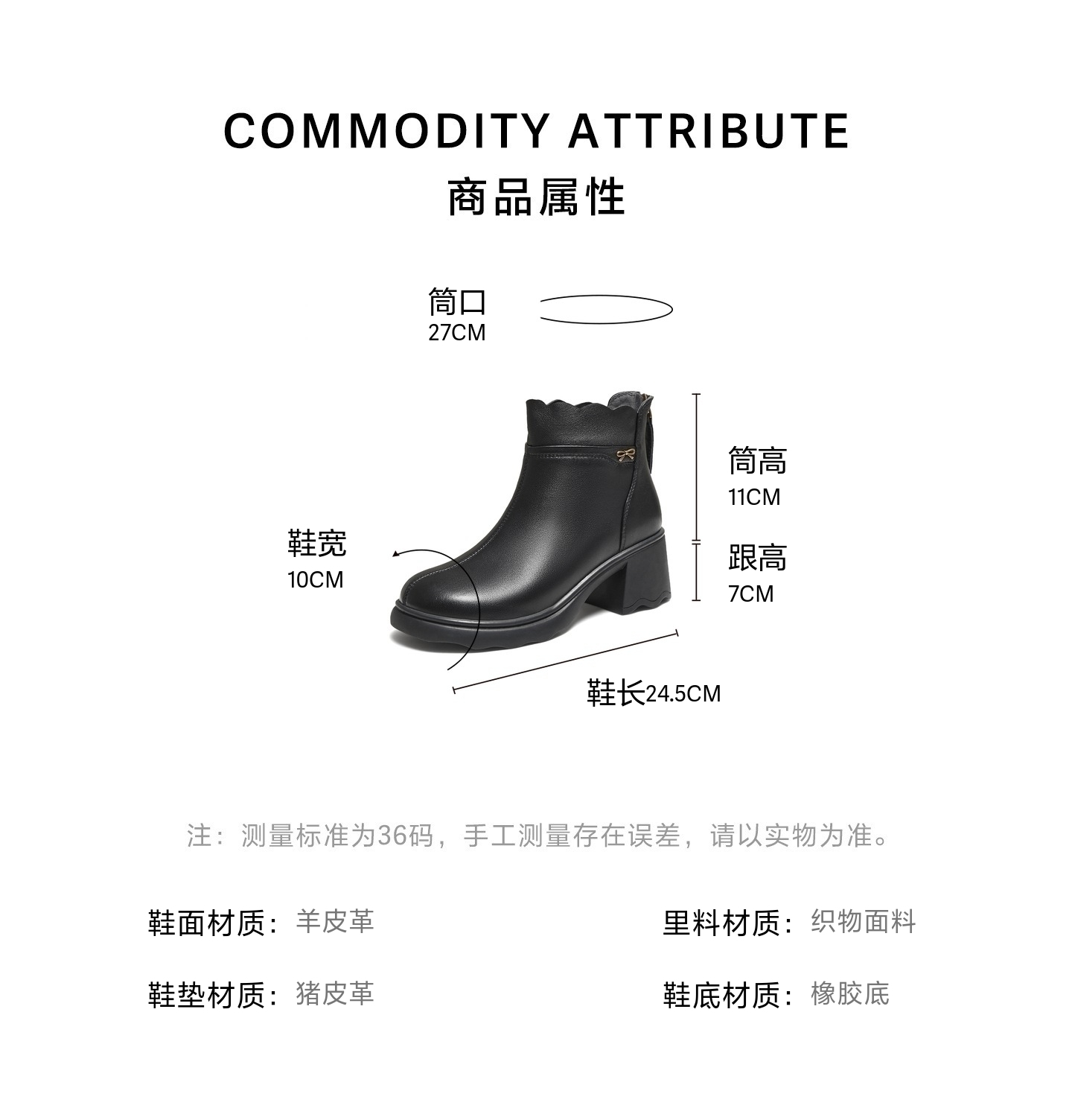 | 鞋底材质:橡胶底 | 靴筒内里材质:织物面料 | 内增高:无 | 鞋面材质:羊皮革 | 闭合方式:后拉链 |