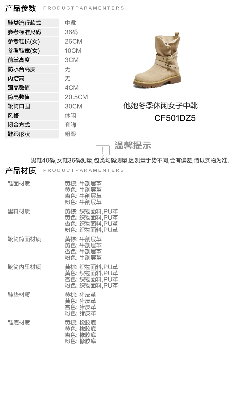 | 靴筒筒面材质:牛剖层革 | 里料材质:PU革织物面料 | 制鞋工艺:胶贴皮鞋 | 鞋垫材质:猪皮革 | 款式季节:冬季 |