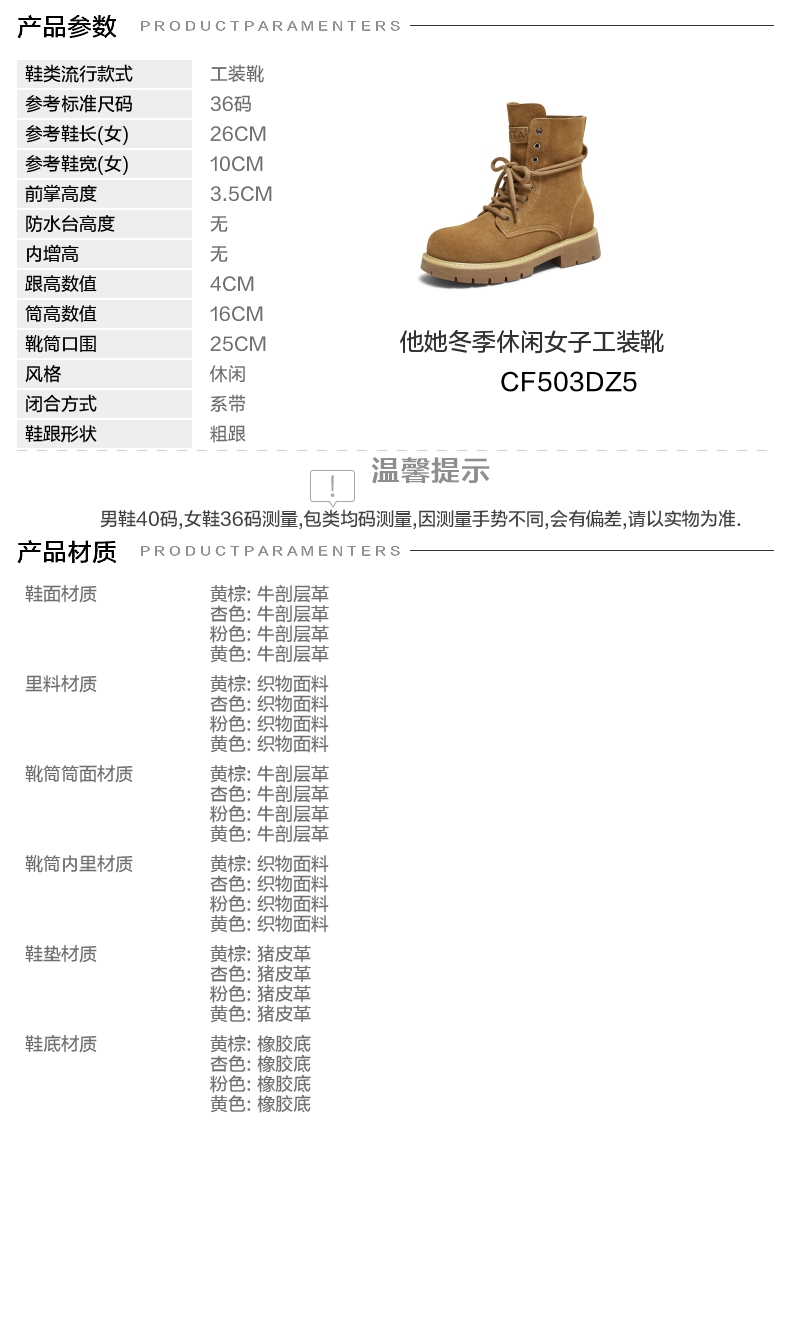 | 配跟:有 | 靴筒口围:25CM | 上市时间:2025年冬季 | 鞋类流行款式:工装靴 | 鞋头款式:圆头 |
