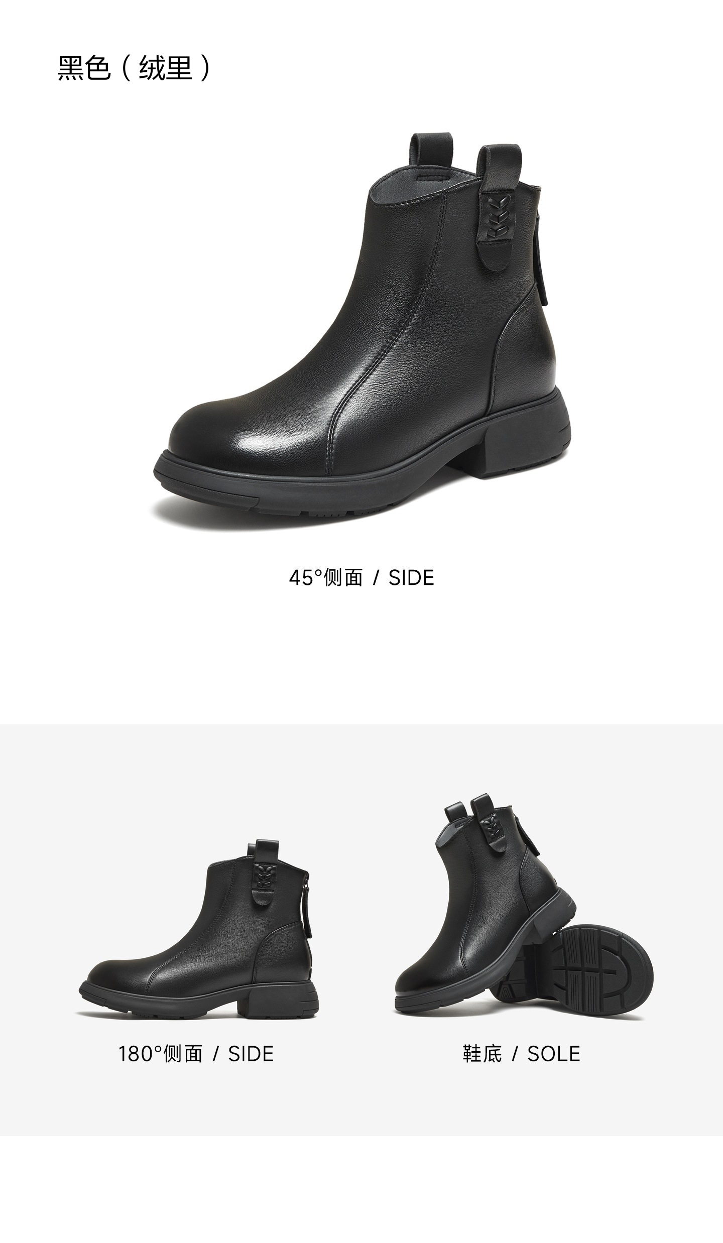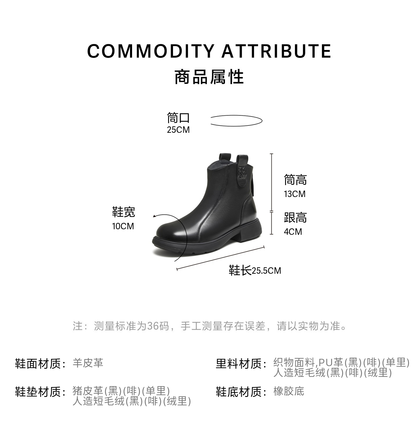| 鞋底材质:橡胶底 | 靴筒内里材质:人造短毛绒 | 内增高:无 | 鞋面材质:羊皮革 | 闭合方式:后拉链 |