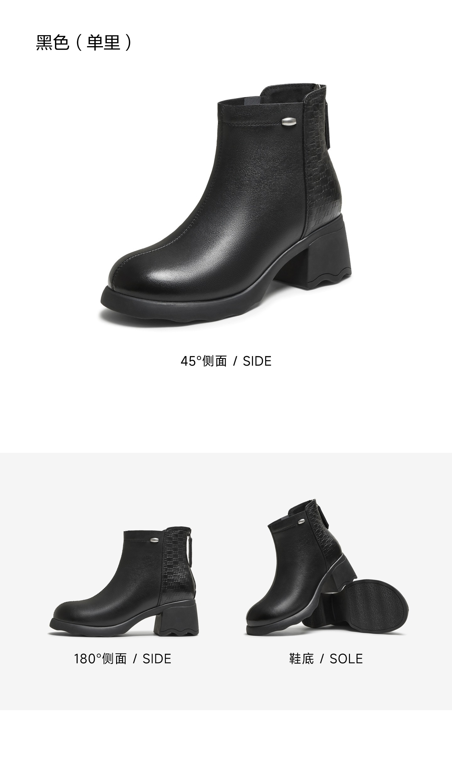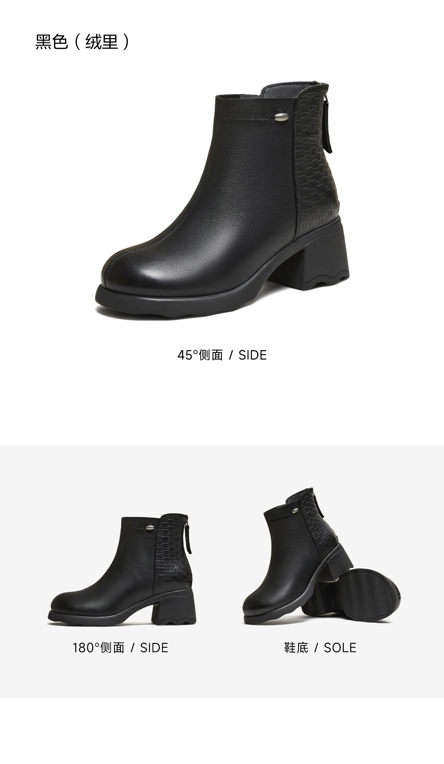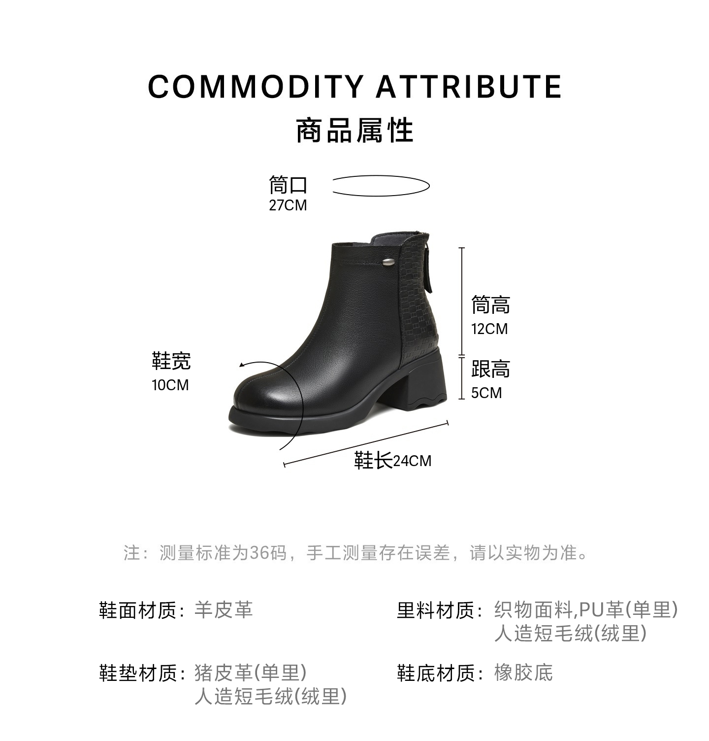 | 鞋底材质:橡胶底 | 靴筒内里材质:人造短毛绒 | 内增高:无 | 鞋面材质:羊皮革 | 闭合方式:后拉链 |