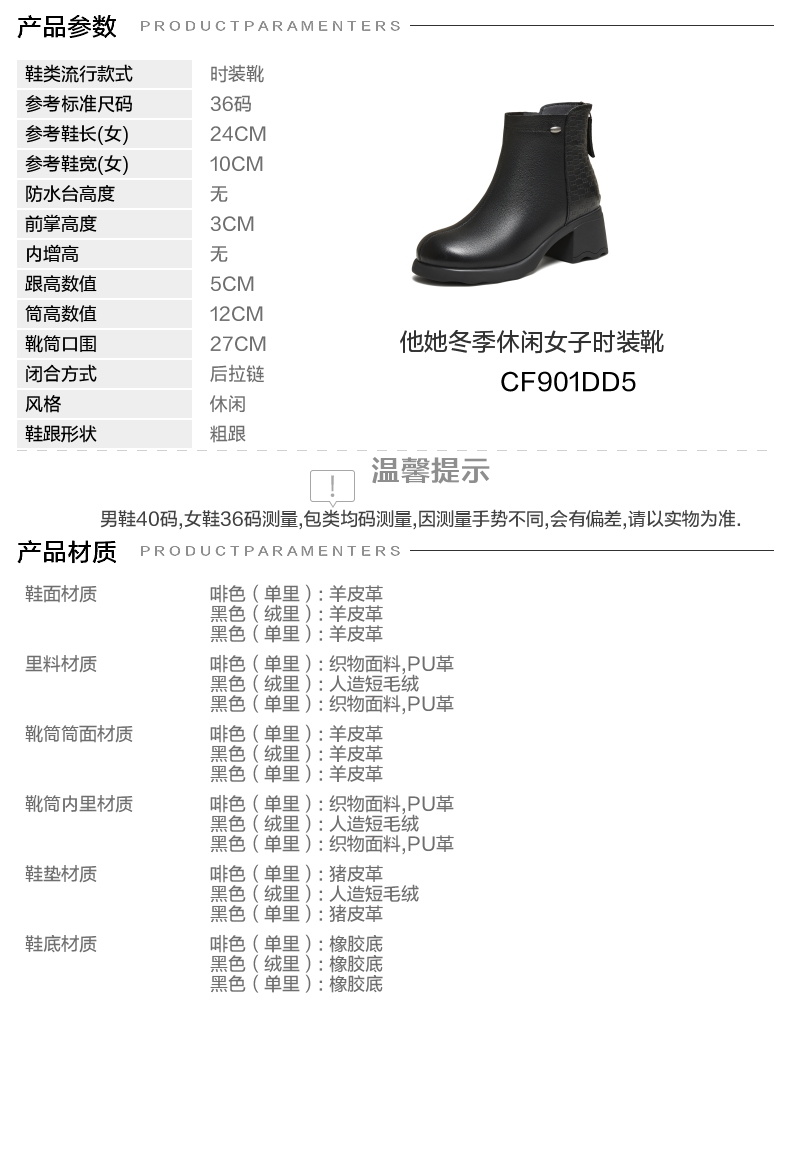 | 参考鞋宽(女):10CM | 风格:休闲 | 色系:黑色 | 跟高数值:5CM | 筒高数值:12CM |