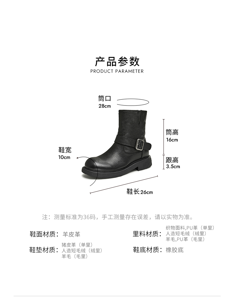 | 鞋底材质:橡胶底 | 靴筒内里材质:人造短毛绒 | 内增高:无 | 鞋面材质:羊皮革 | 适用场合:日常休闲 |