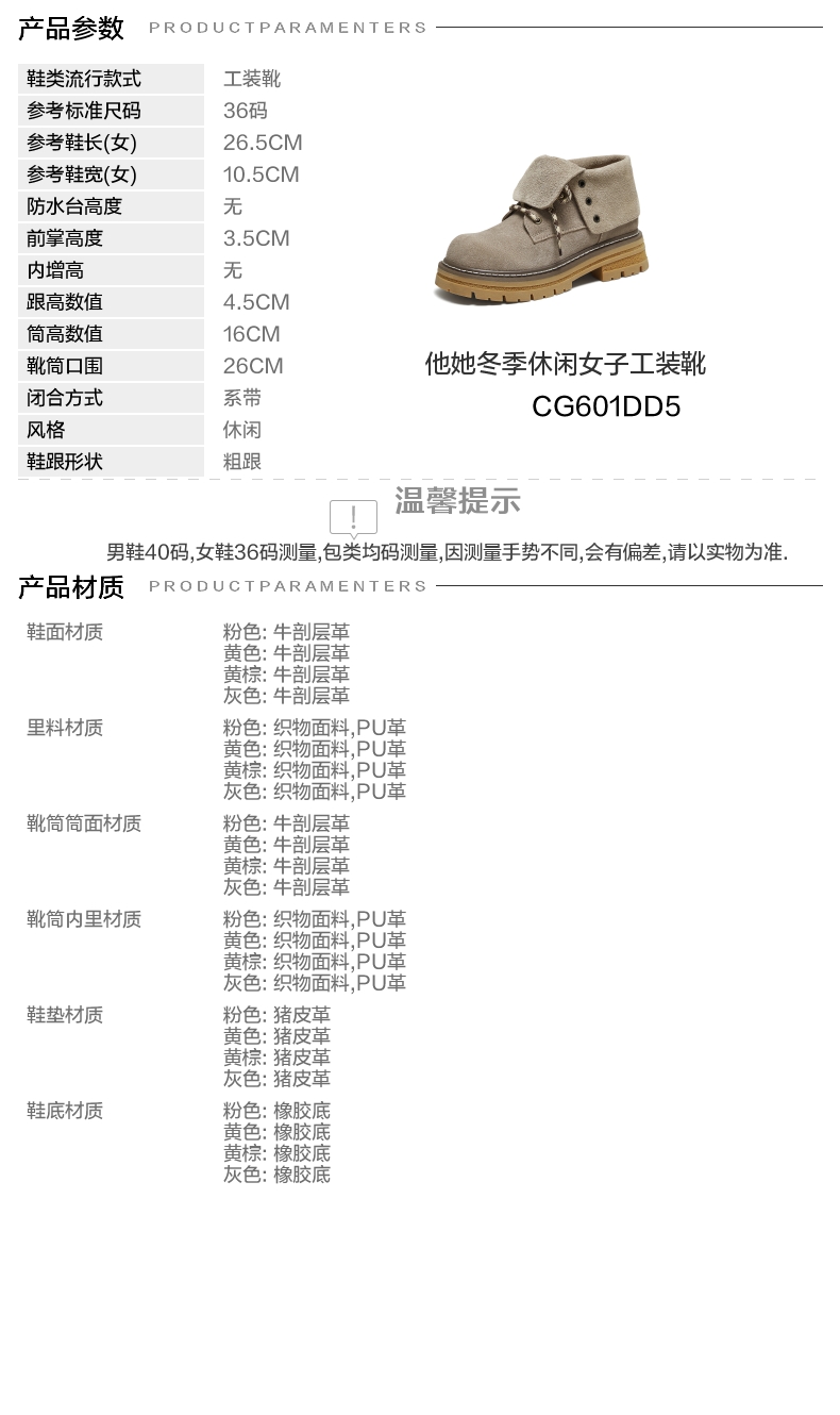 | 帮面材质:牛剖层革 | 配跟:有 | 靴筒口围:26CM | 上市时间:2025年冬季 | 鞋类流行款式:工装靴 |