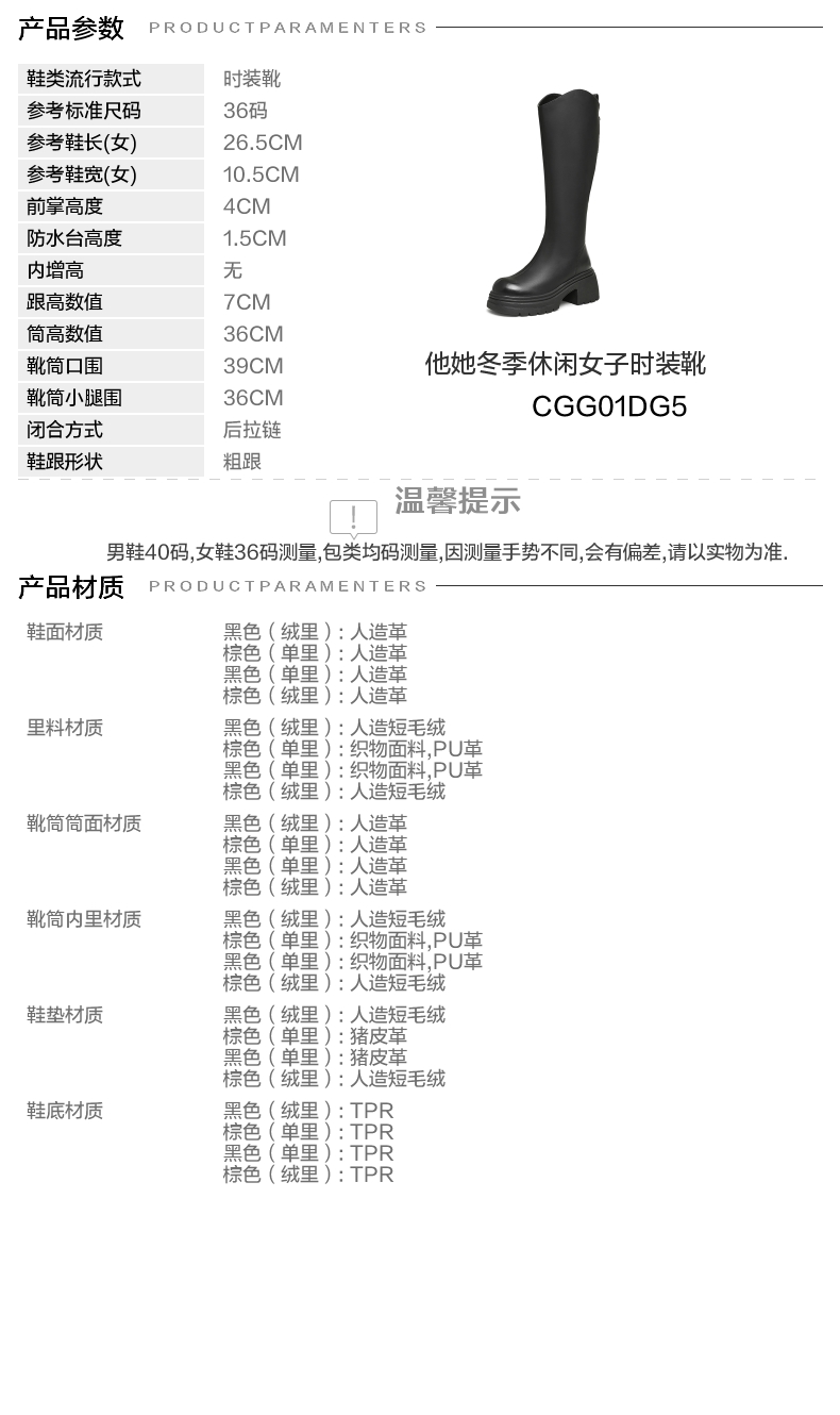| 靴筒筒面材质:人造革 | 靴筒小腿围:36CM | 里料材质:PU革织物面料 | 制鞋工艺:胶贴皮鞋 | 鞋垫材质:猪皮革 |
