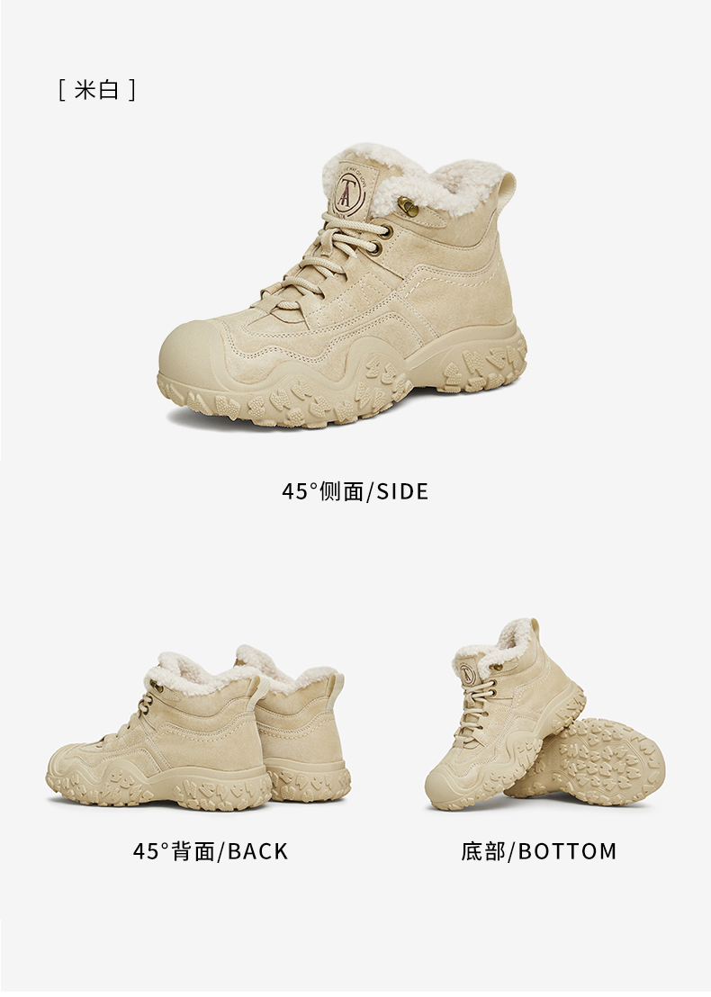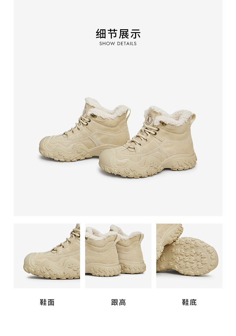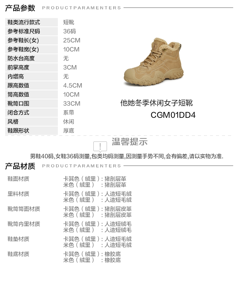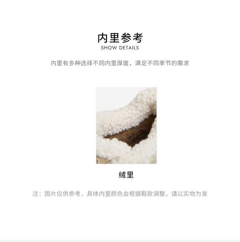 鞋底材质:橡胶底 靴筒内里材质:人造短绒毛 内增高:无 鞋面材质:猪剖层革 适用场合:日常休闲