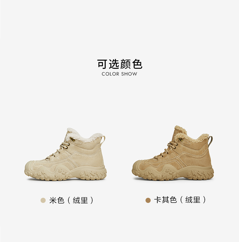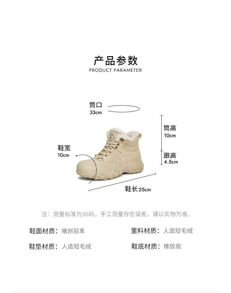 性别:女子 靴筒筒面材质:猪剖层皮革 里料材质:人造短毛绒 制鞋工艺:胶贴皮鞋 款式季节:冬季