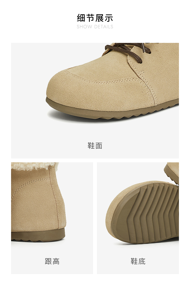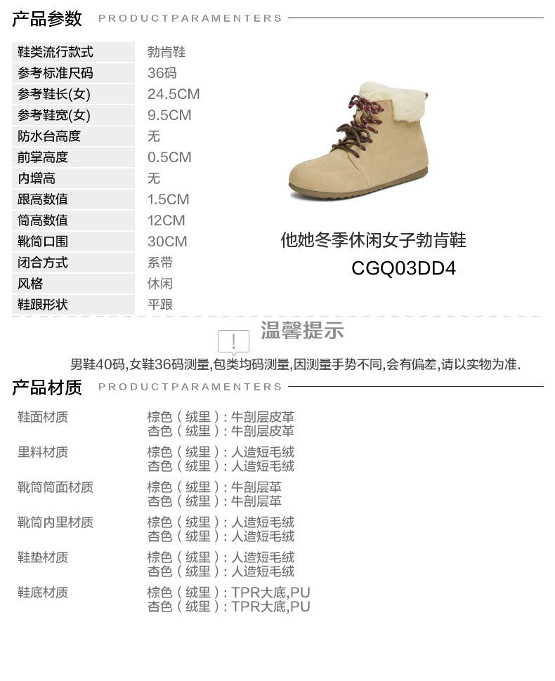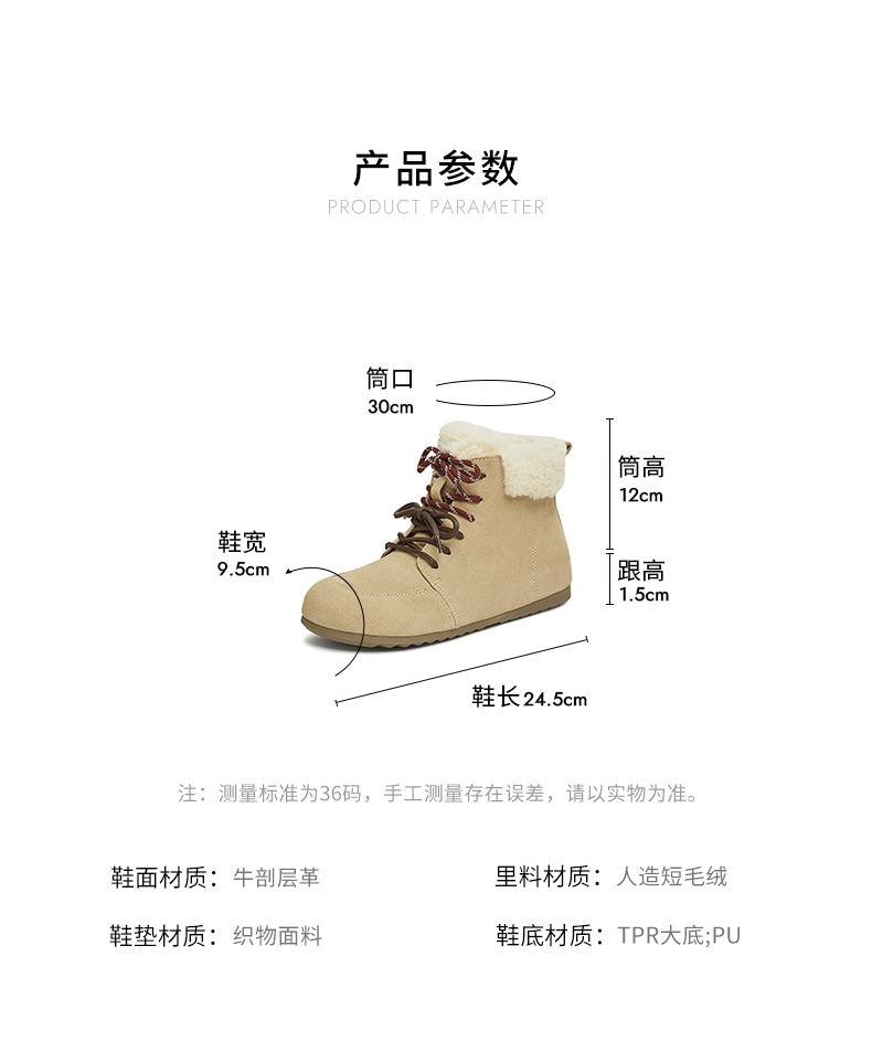 | 鞋底材质:PUTPR大底 | 靴筒内里材质:人造短毛绒 | 内增高:无 | 鞋面材质:牛剖层皮革 | 适用场合:日常休闲 |