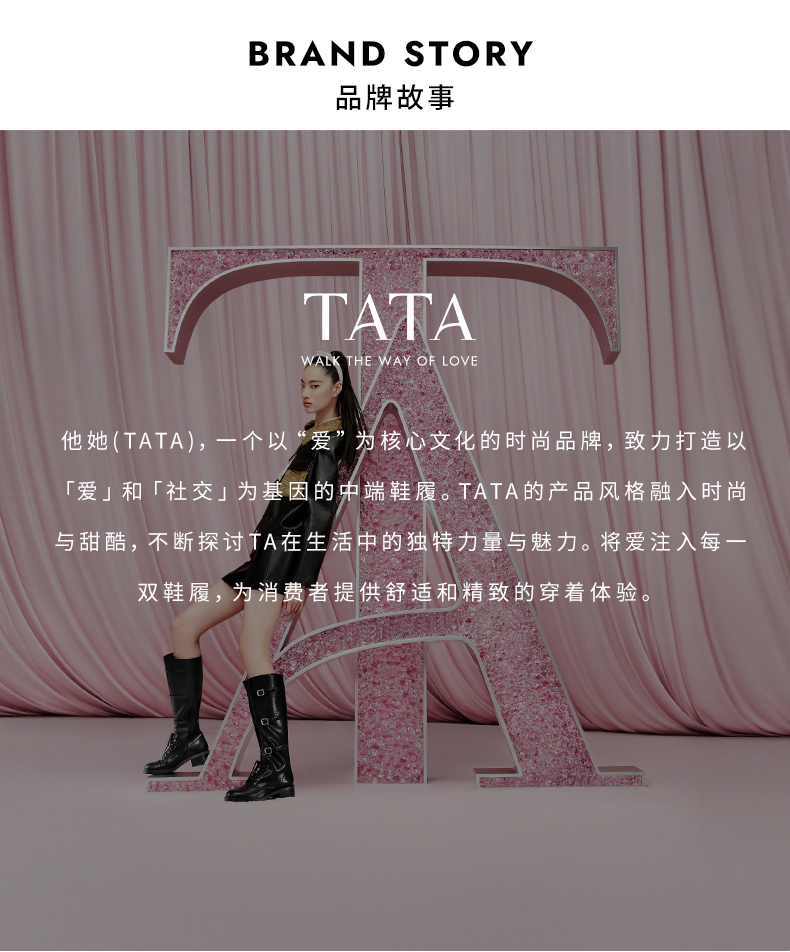 他她(Tata),品牌成立于2003年,致力为都市年轻人群提供时尚潮流、具有性价比的鞋履产品。十五年来“踏踏”的着地声,寓意都市白领元气满满的生活,如时尚“伴履”的TATA一直陪伴左右、伴随走出TATA的时尚步伐。2017年TATA美丽蜕变,TATA STAR元素的加入预示品牌将成为闪亮、前端的时尚鞋履品牌。