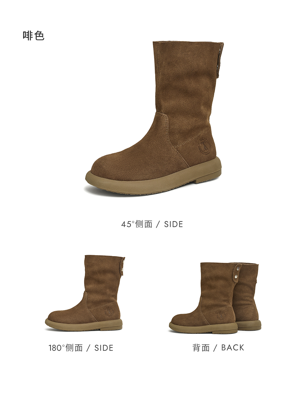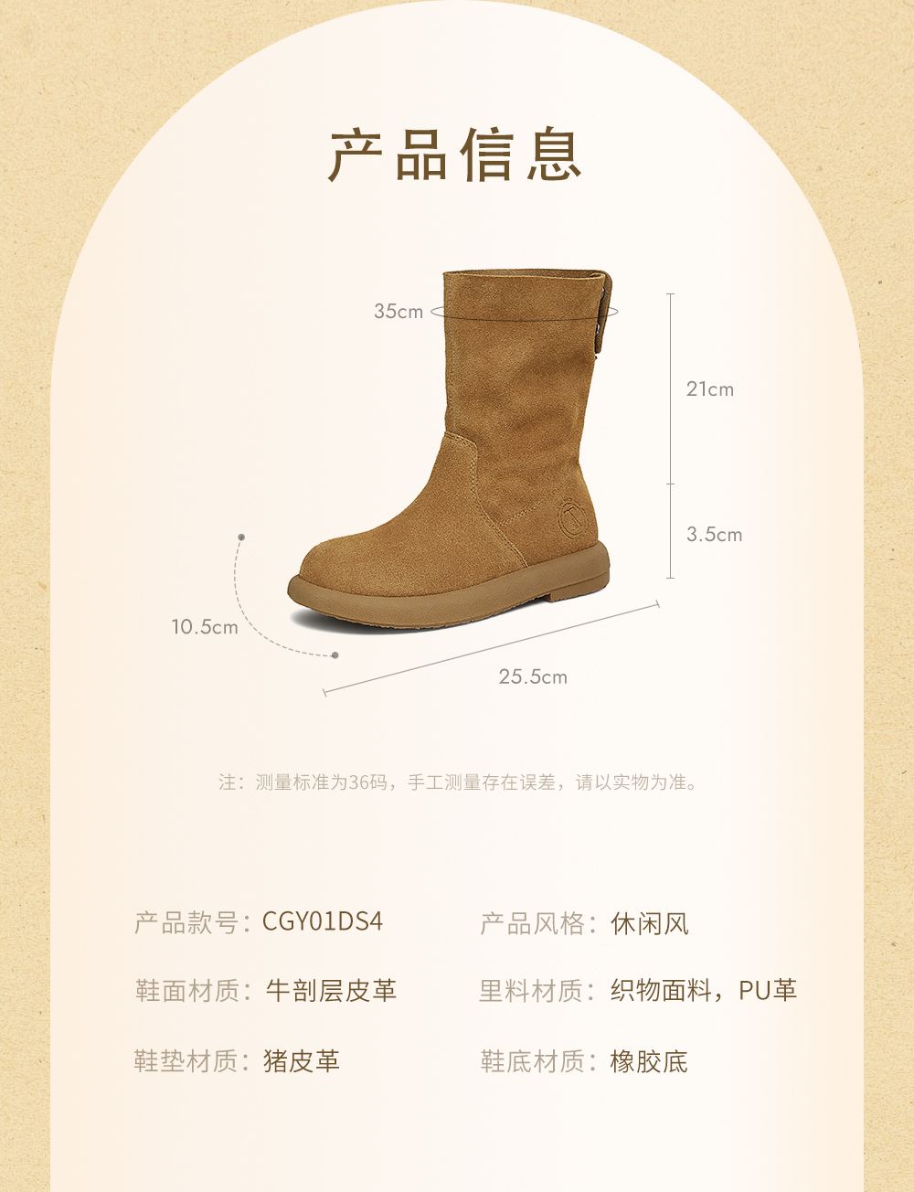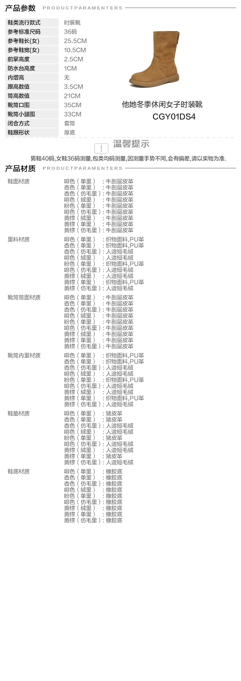 | 靴筒筒面材质:牛剖层皮革 | 靴筒小腿围:33CM | 里料材质:织物面料PU革 | 制鞋工艺:胶贴皮鞋 | 款式季节:冬季 |