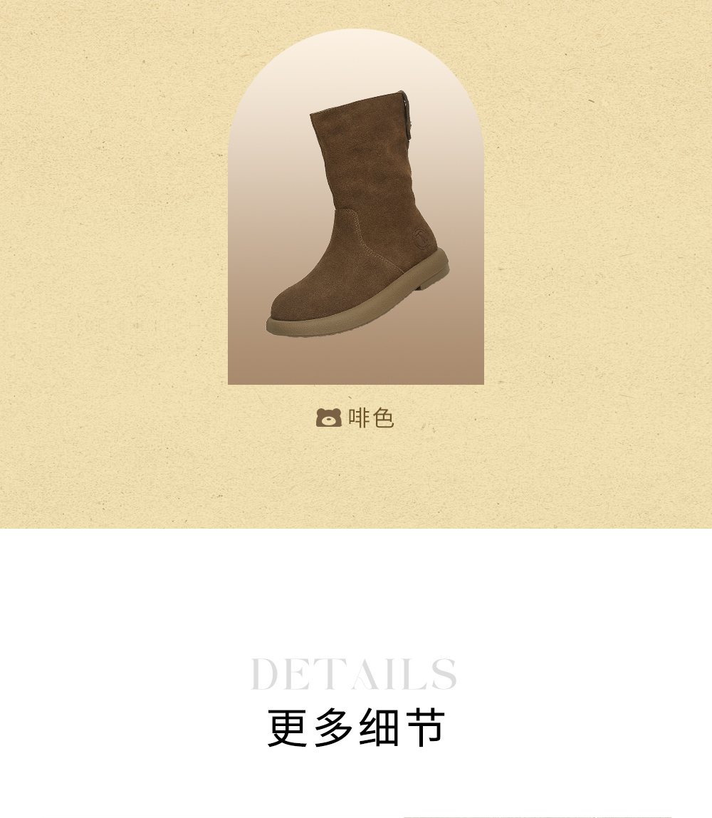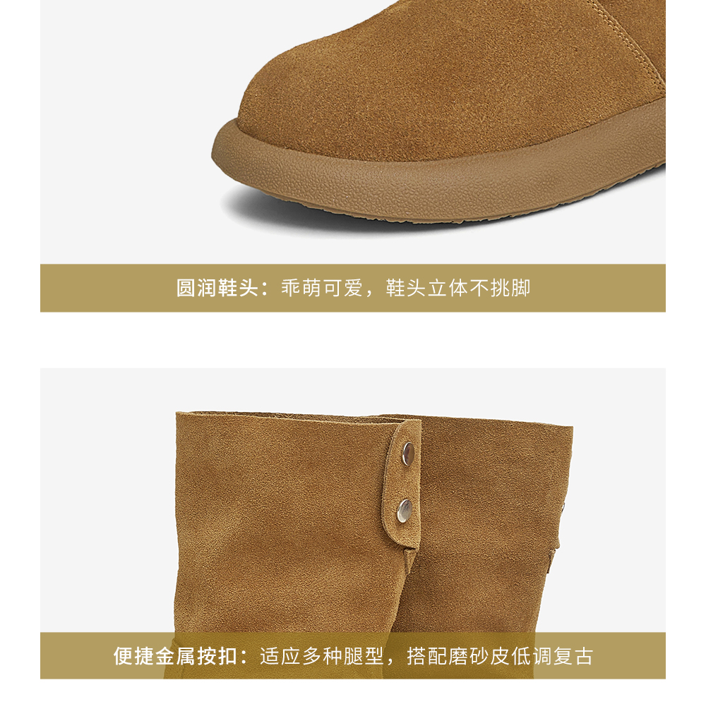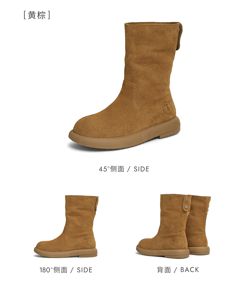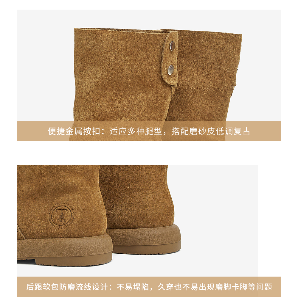 | 靴筒筒面材质:牛剖层皮革 | 靴筒小腿围:33CM | 里料材质:PU革织物面料 | 制鞋工艺:胶贴皮鞋 | 款式季节:冬季 |