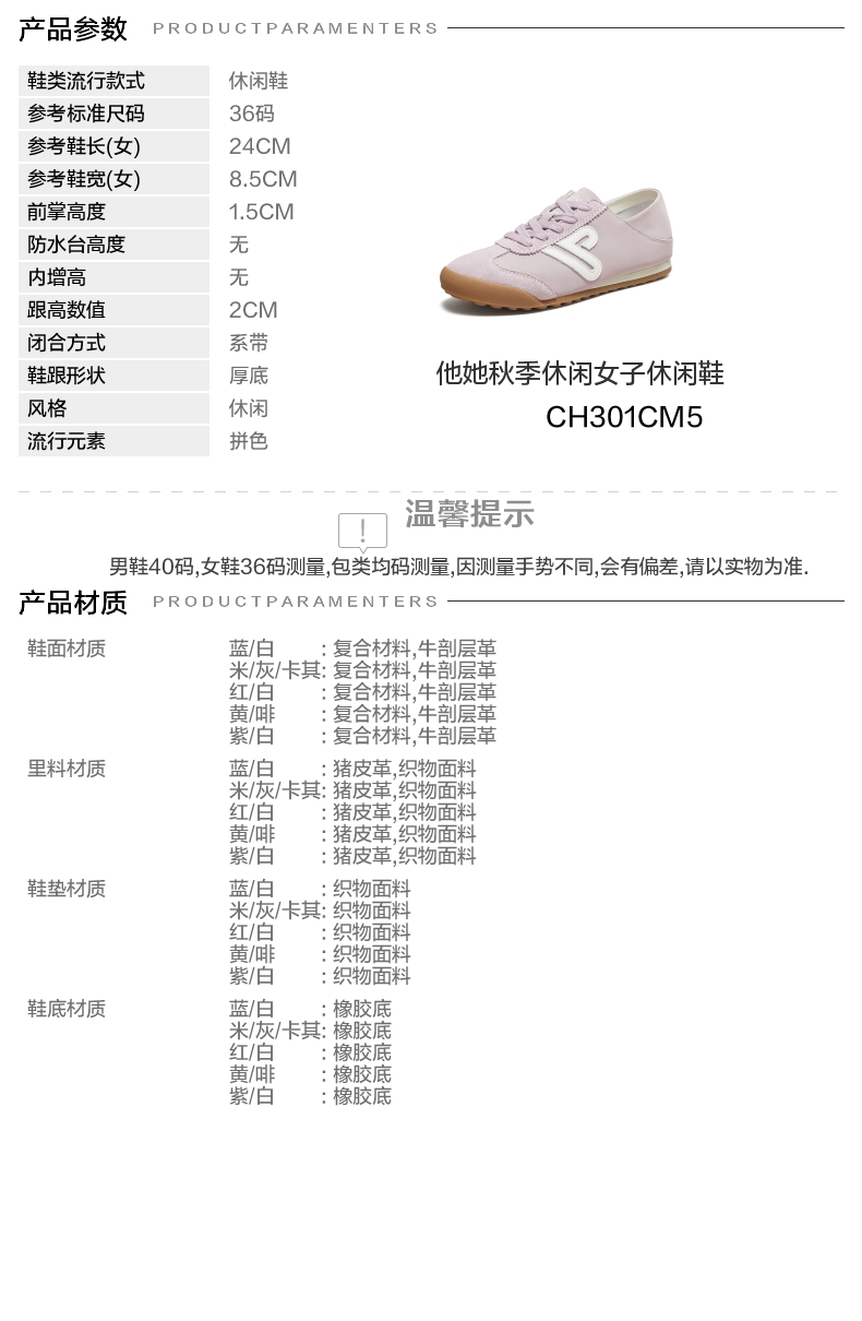 | 鞋跟形状:厚底 | 参考鞋长(女):24CM | 流行元素:拼色 | 参考鞋宽(女):8.5CM | 风格:休闲 |