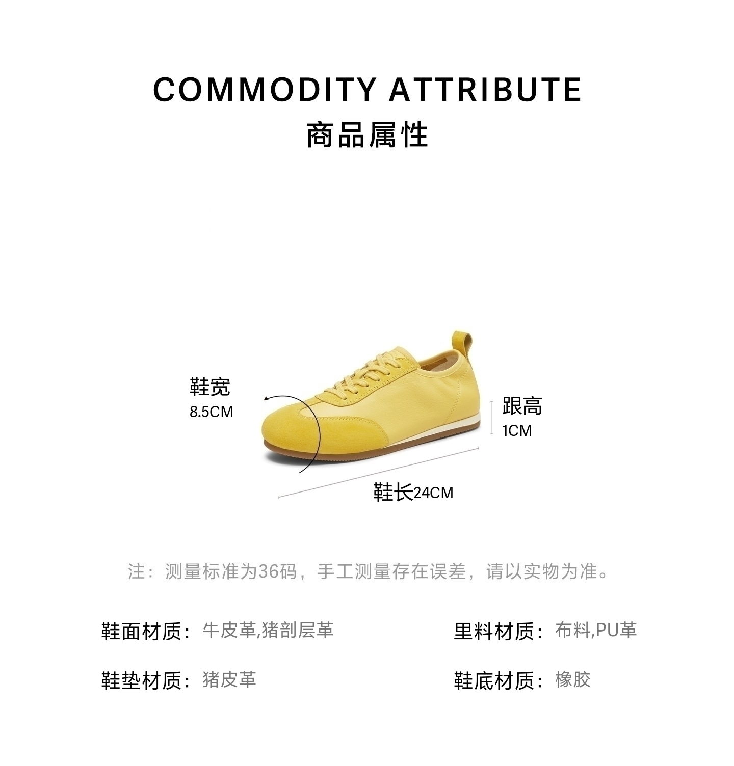 | 色系:黄色 | 跟高数值:1CM | 性别:女子 | 里料材质:布料PU革 | 制鞋工艺:胶贴皮鞋 |