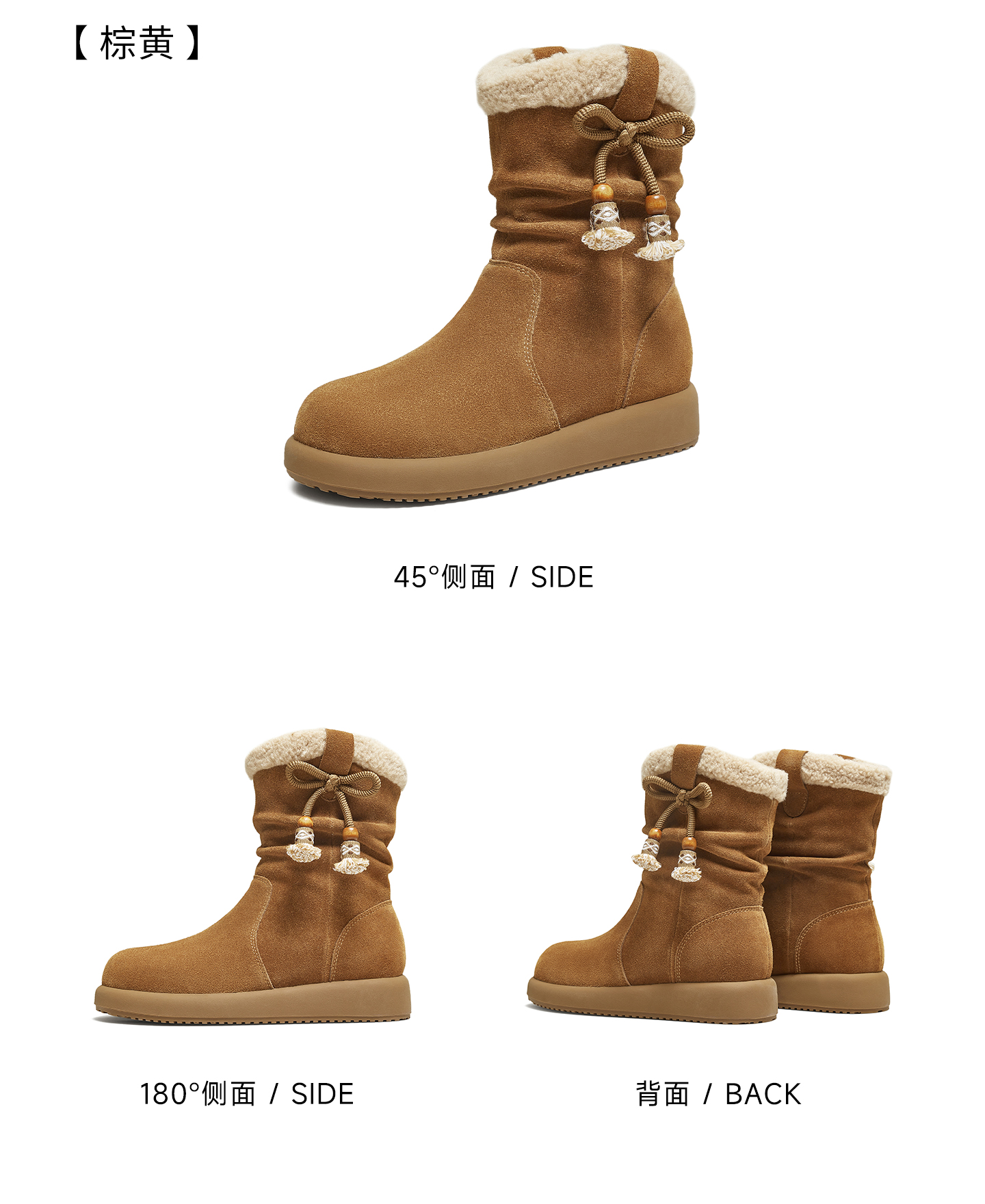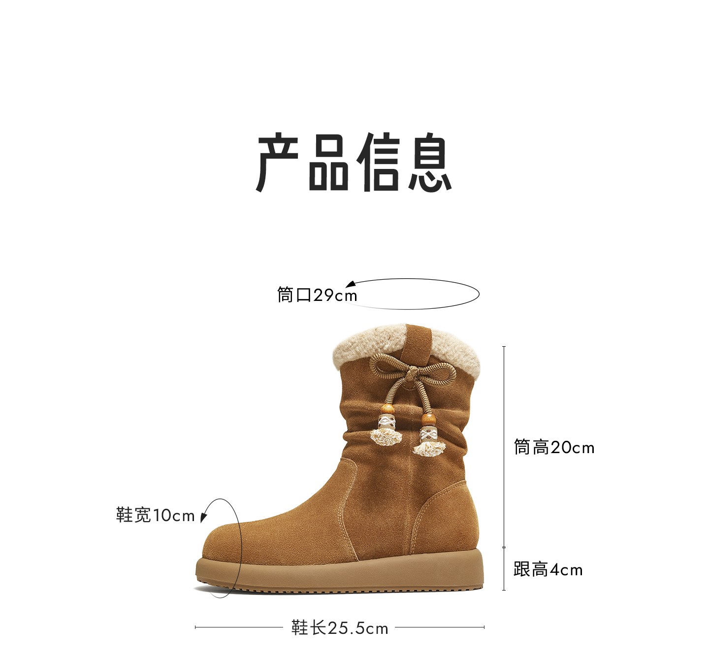 | 靴筒筒面材质:牛剖层革 | 靴筒小腿围:28CM | 里料材质:人造长毛绒 | 制鞋工艺:胶贴皮鞋 | 鞋垫材质:人造短毛绒 |