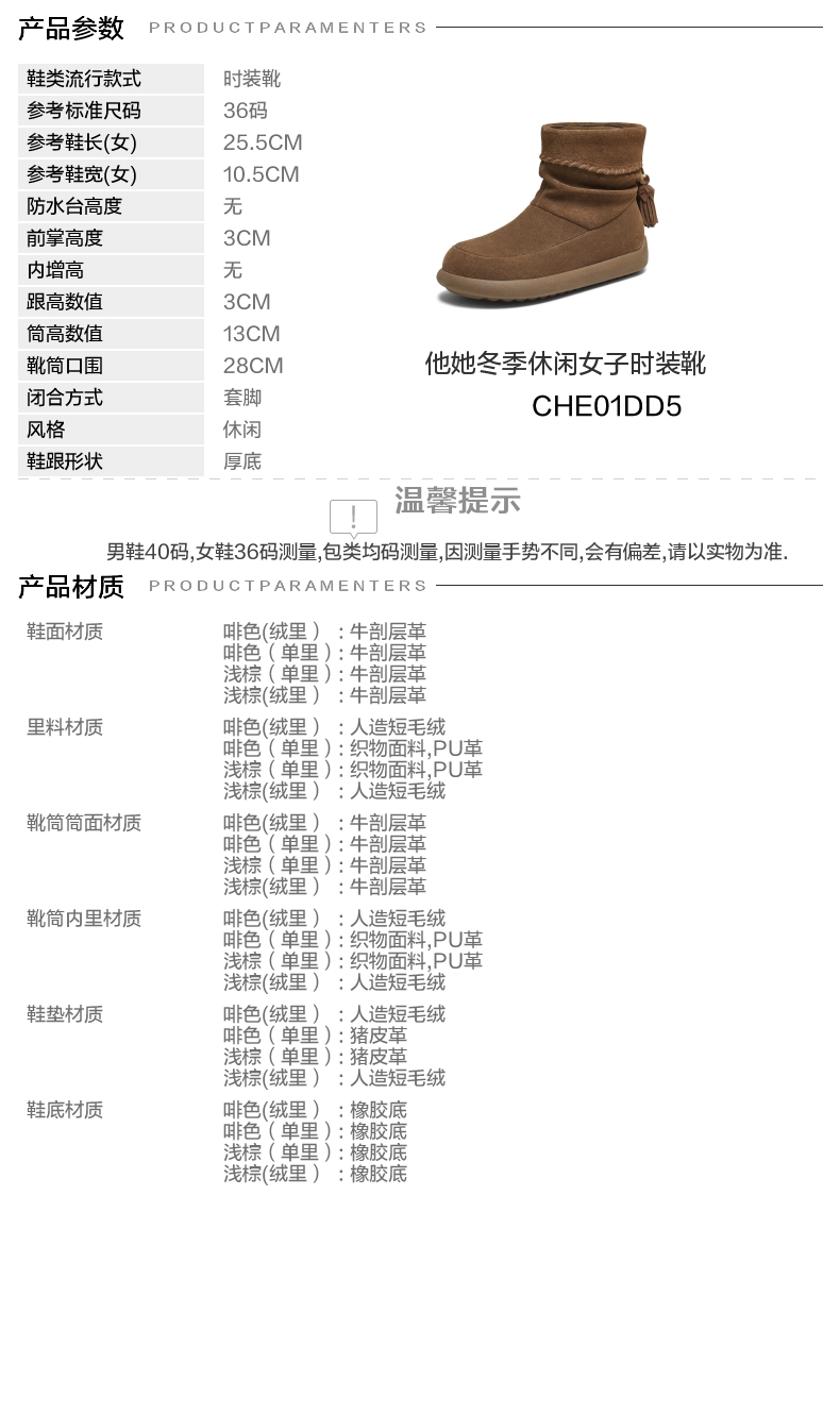 | 参考鞋宽(女):10.5CM | 风格:休闲 | 色系:咖啡色 | 跟高数值:3CM | 筒高数值:13CM |