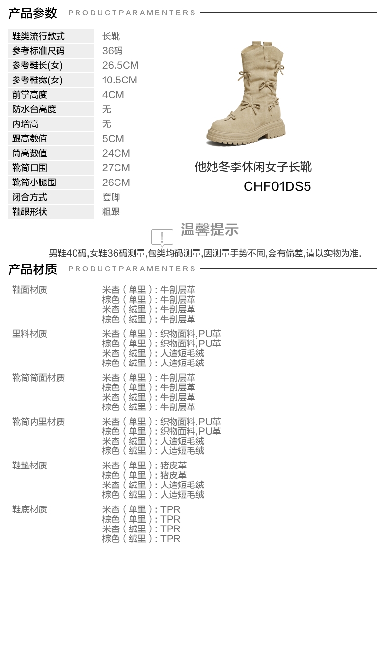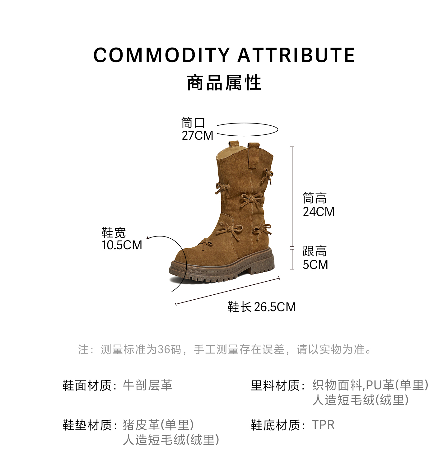| 靴筒筒面材质:牛剖层革 | 靴筒小腿围:26CM | 里料材质:人造短毛绒 | 制鞋工艺:胶贴皮鞋 | 鞋垫材质:人造短毛绒 |