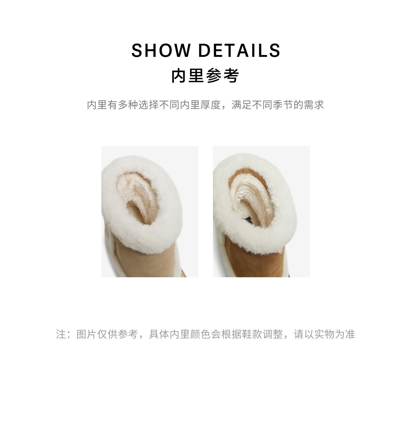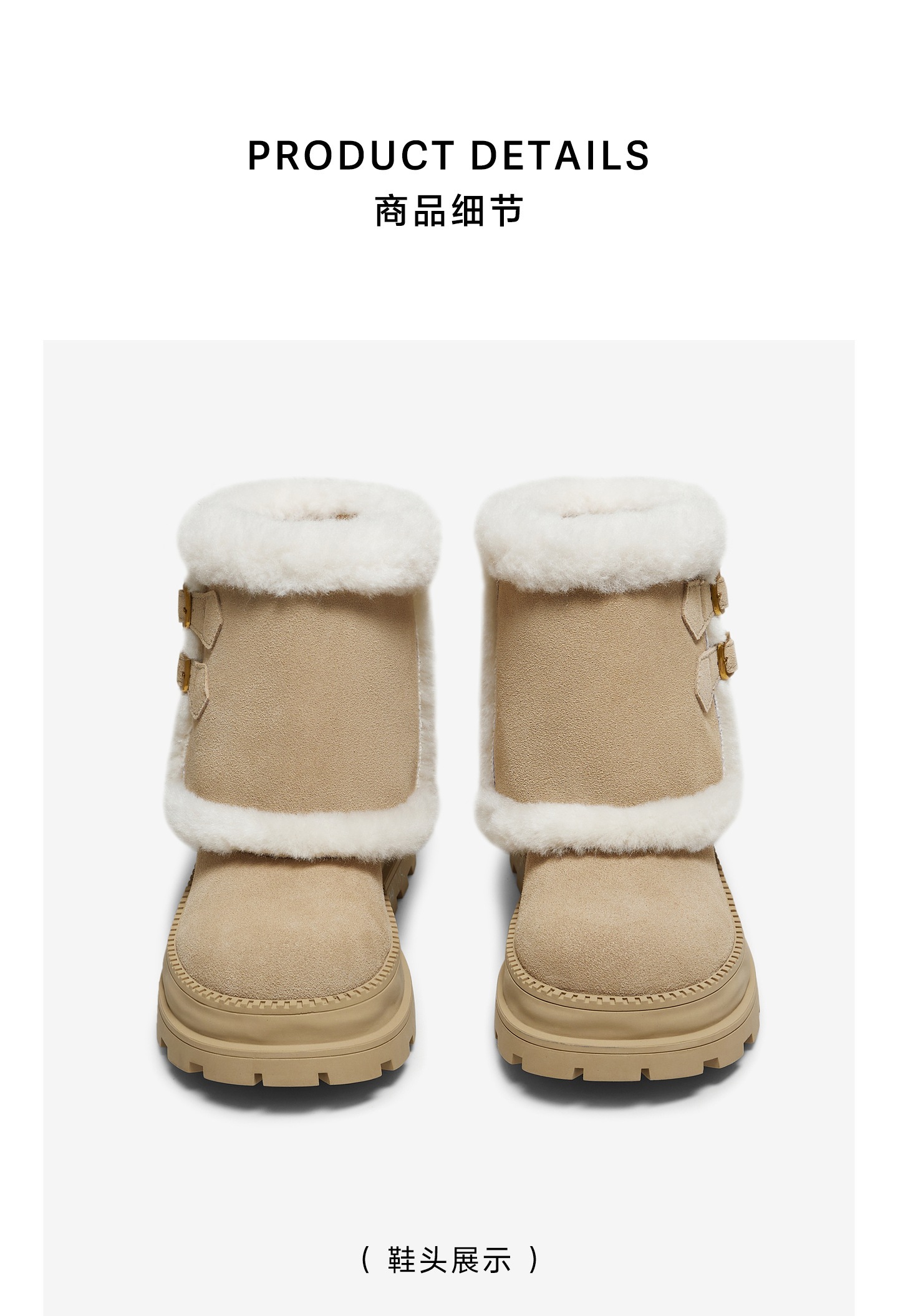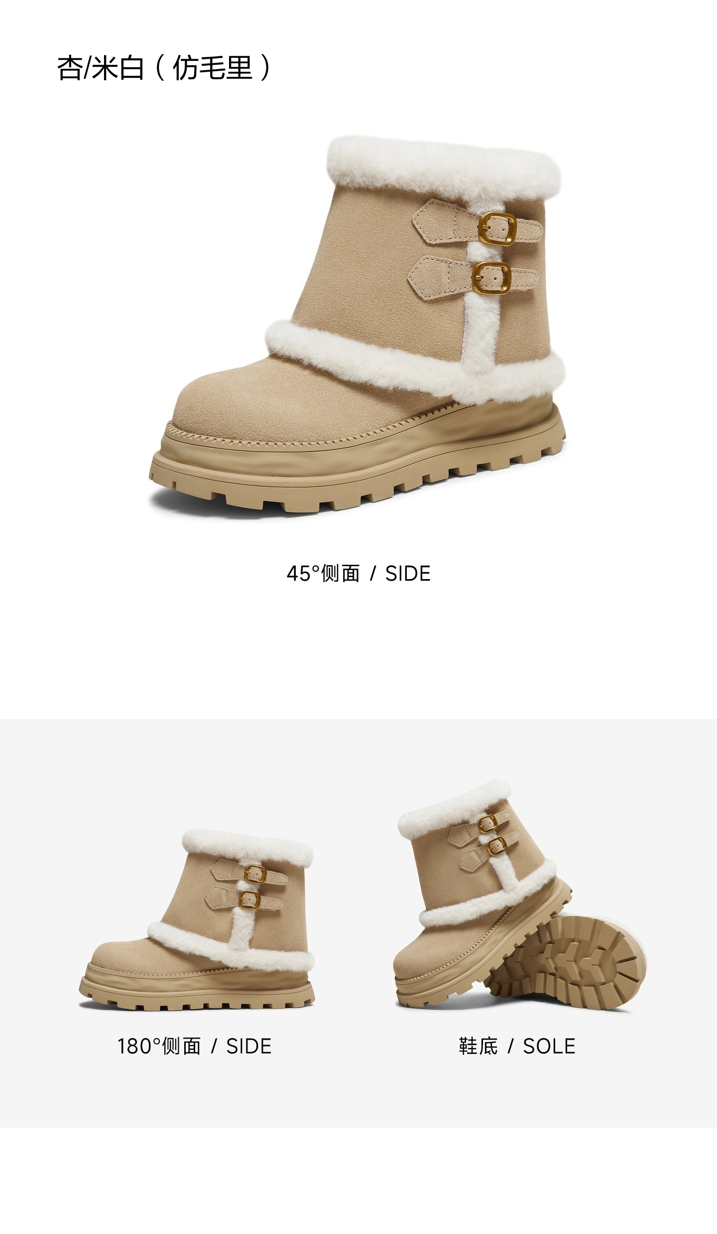 | 帮面材质:织物牛剖层革 | 配跟:无 | 靴筒口围:33CM | 上市时间:2025年冬季 | 鞋类流行款式:雪地靴 |