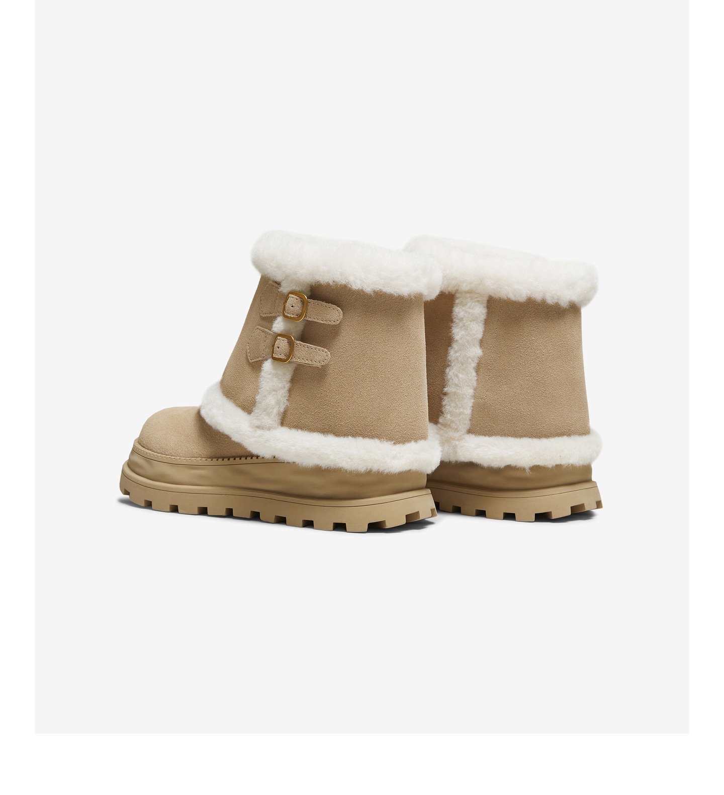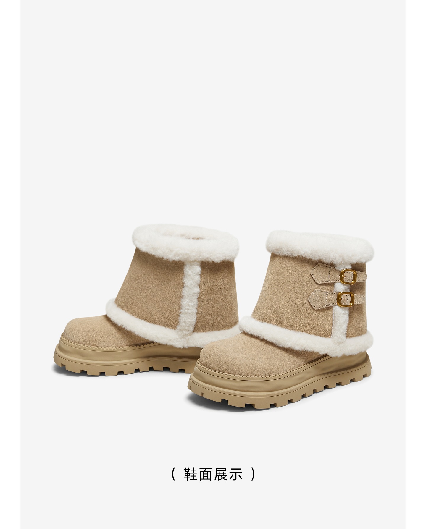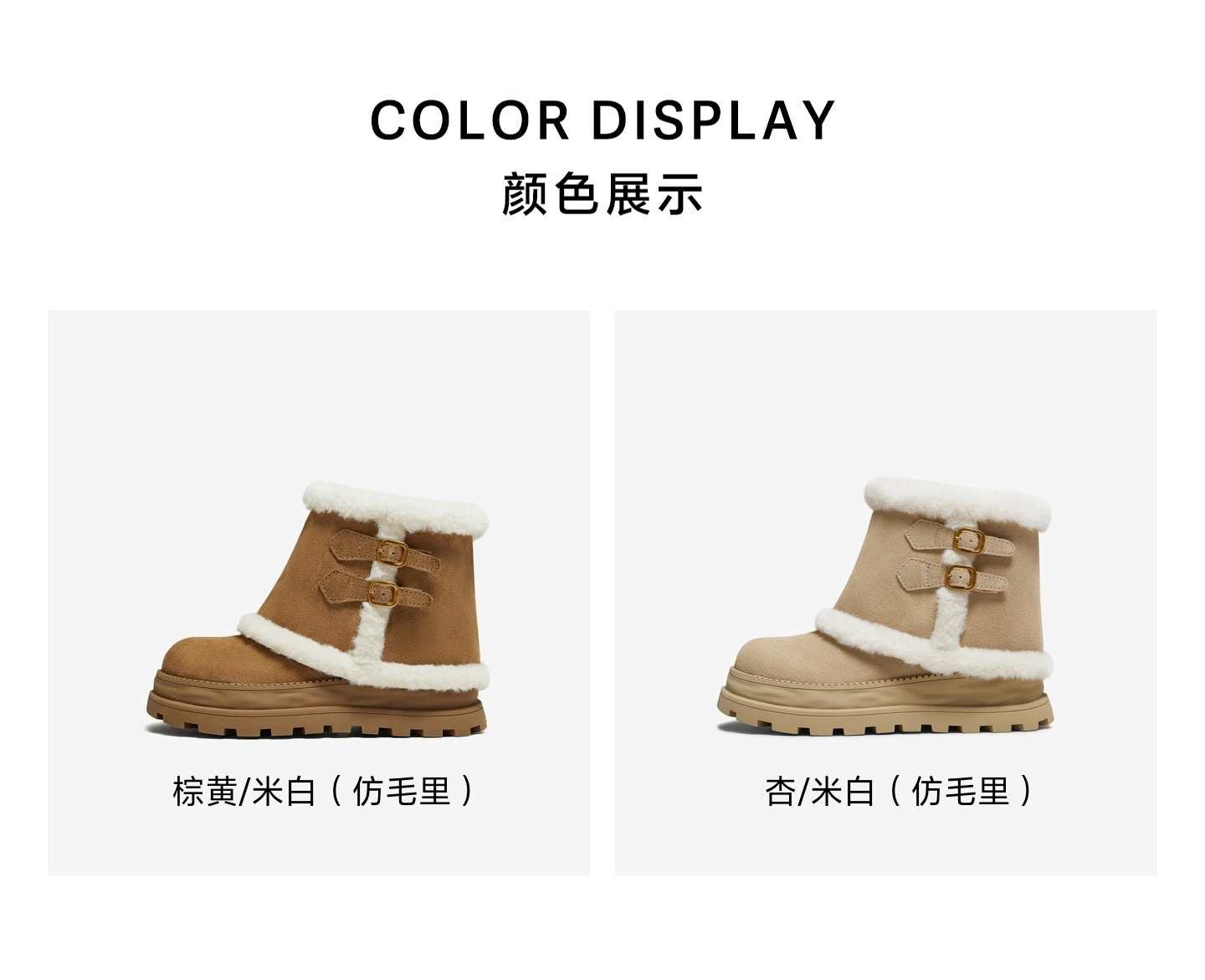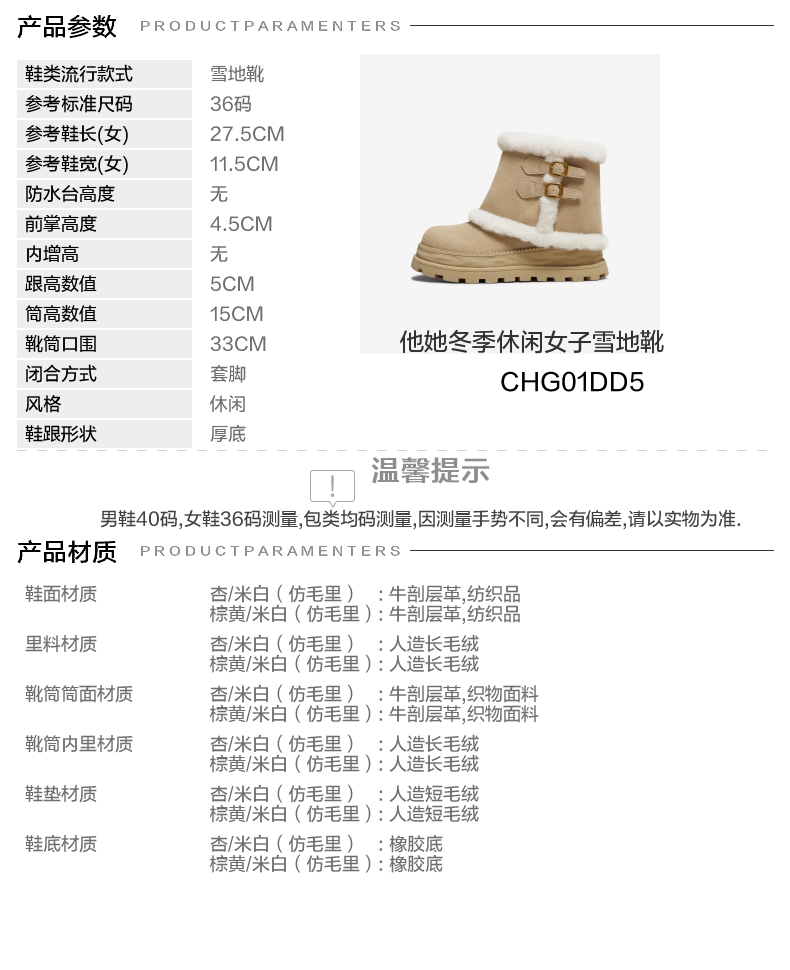 | 帮面材质:织物牛剖层革 | 配跟:无 | 靴筒口围:33CM | 上市时间:2025年冬季 | 鞋类流行款式:雪地靴 |