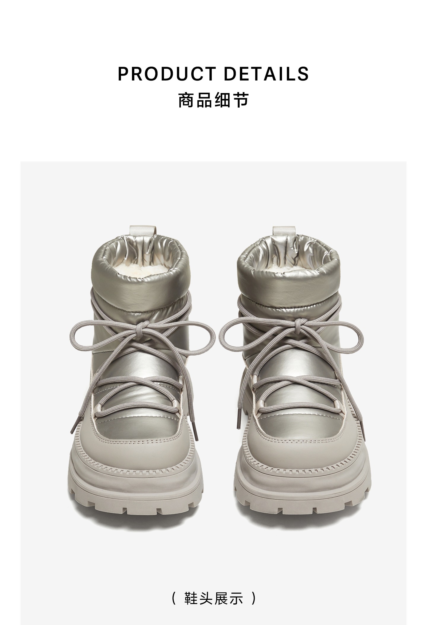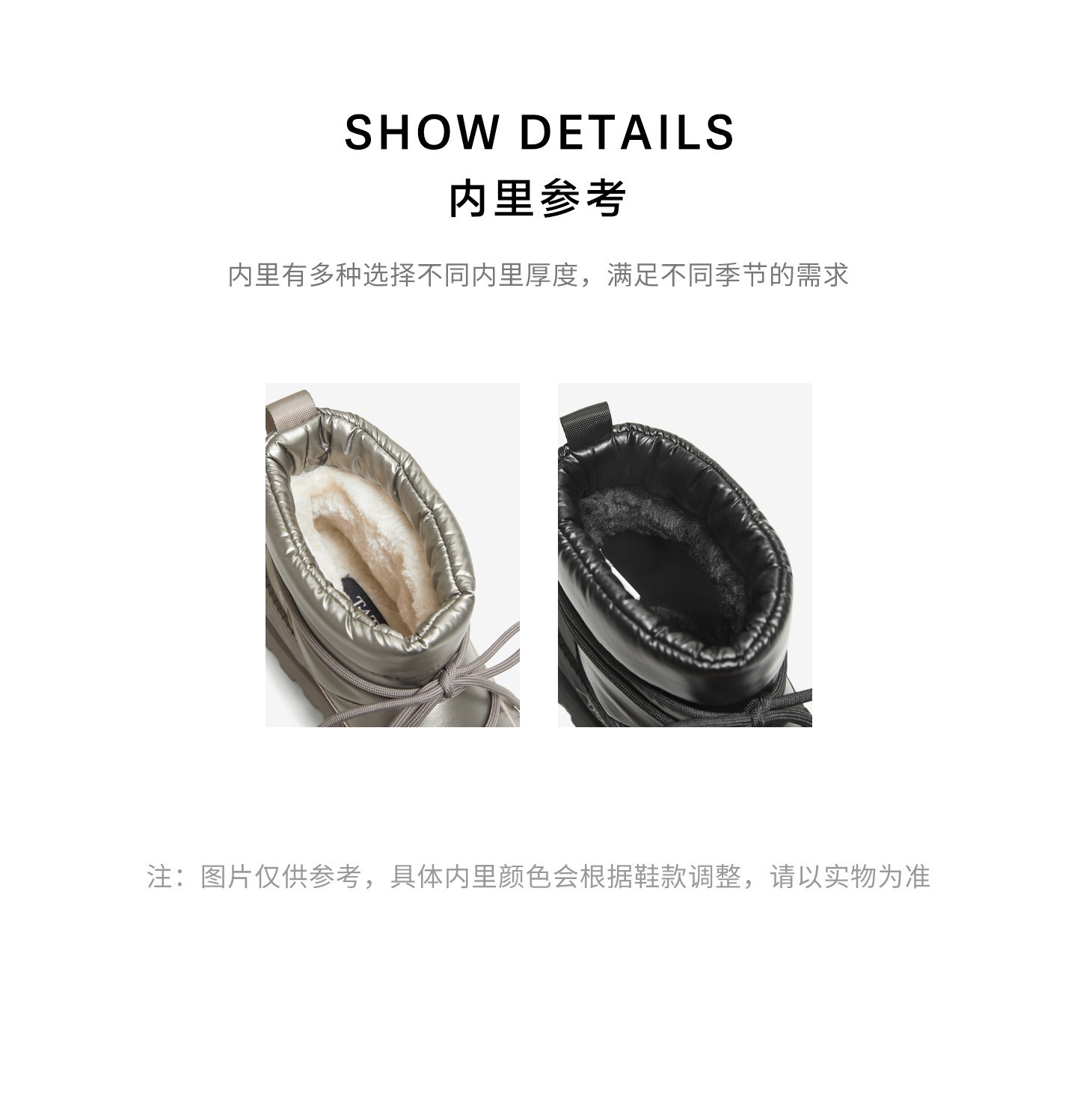 | 帮面材质:复合材料织物 | 配跟:无 | 靴筒口围:30CM | 上市时间:2025年冬季 | 鞋类流行款式:雪地靴 |