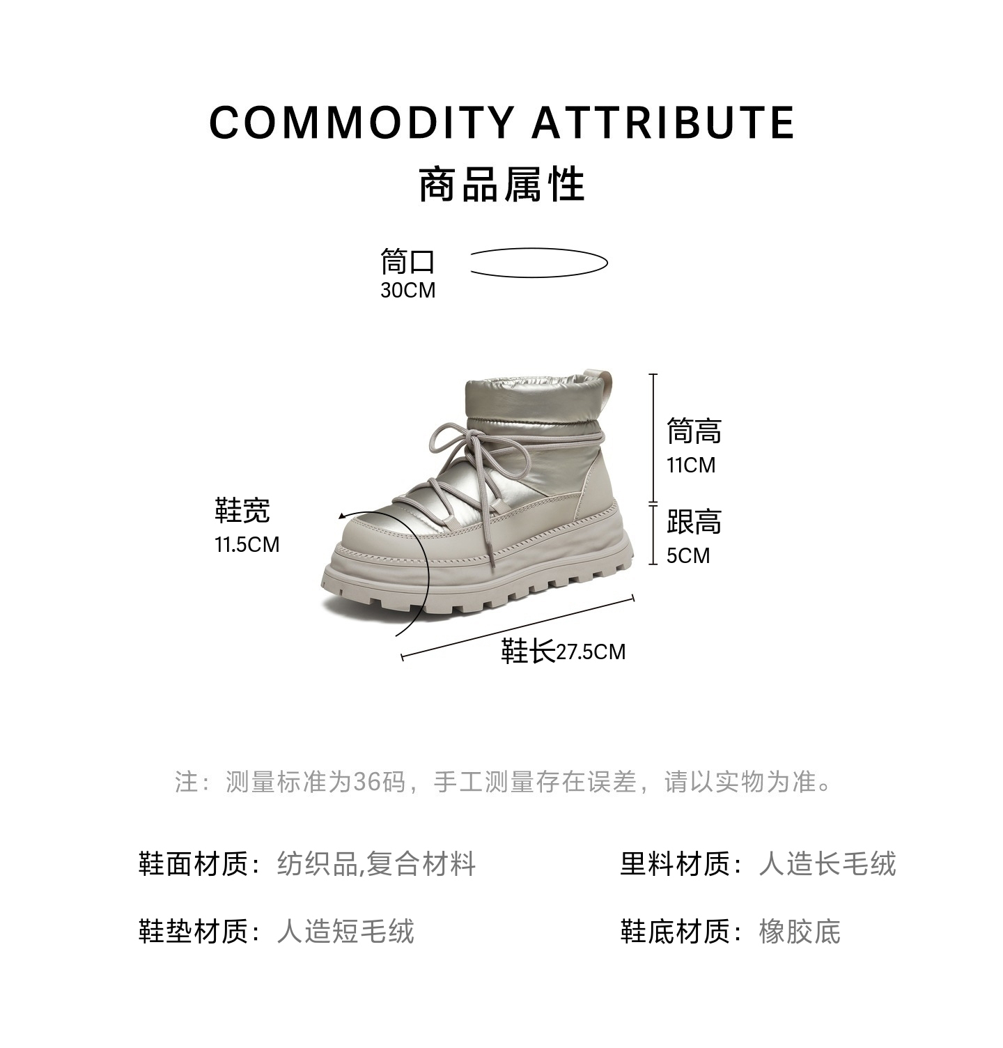 | 参考鞋宽(女):11.5CM | 风格:休闲 | 色系:灰色 | 跟高数值:5CM | 筒高数值:11CM |