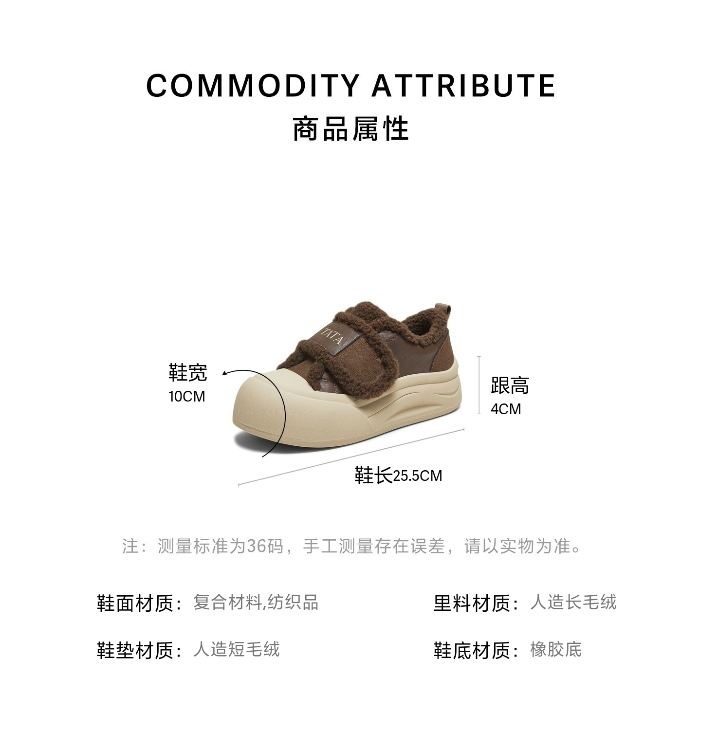 | 色系:咖啡色 | 跟高数值:4CM | 适用人群:女子 | 性别:女子 | 里料材质:人造长毛绒 |