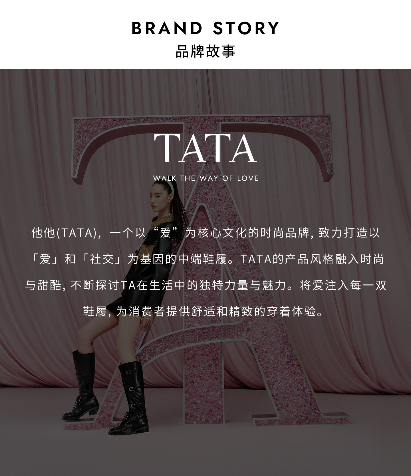 他她(Tata),品牌成立于2003年,致力为都市年轻人群提供时尚潮流、具有性价比的鞋履产品。十五年来“踏踏”的着地声,寓意都市白领元气满满的生活,如时尚“伴履”的TATA一直陪伴左右、伴随走出TATA的时尚步伐。2017年TATA美丽蜕变,TATA STAR元素的加入预示品牌将成为闪亮、前端的时尚鞋履品牌。