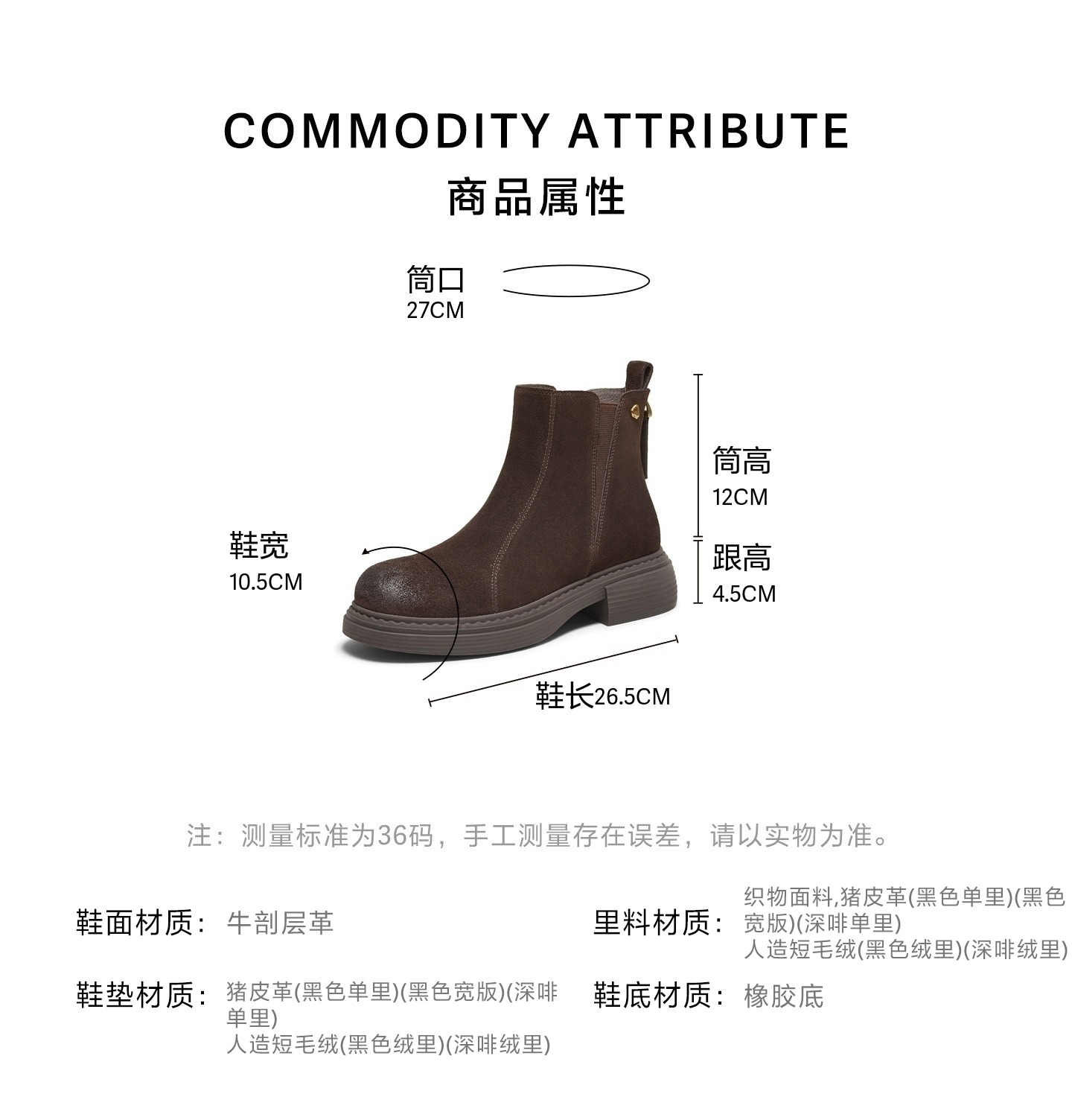 | 帮面材质:牛剖层革 | 配跟:有 | 靴筒口围:27CM | 上市时间:2025年冬季 | 鞋类流行款式:切尔西靴 |