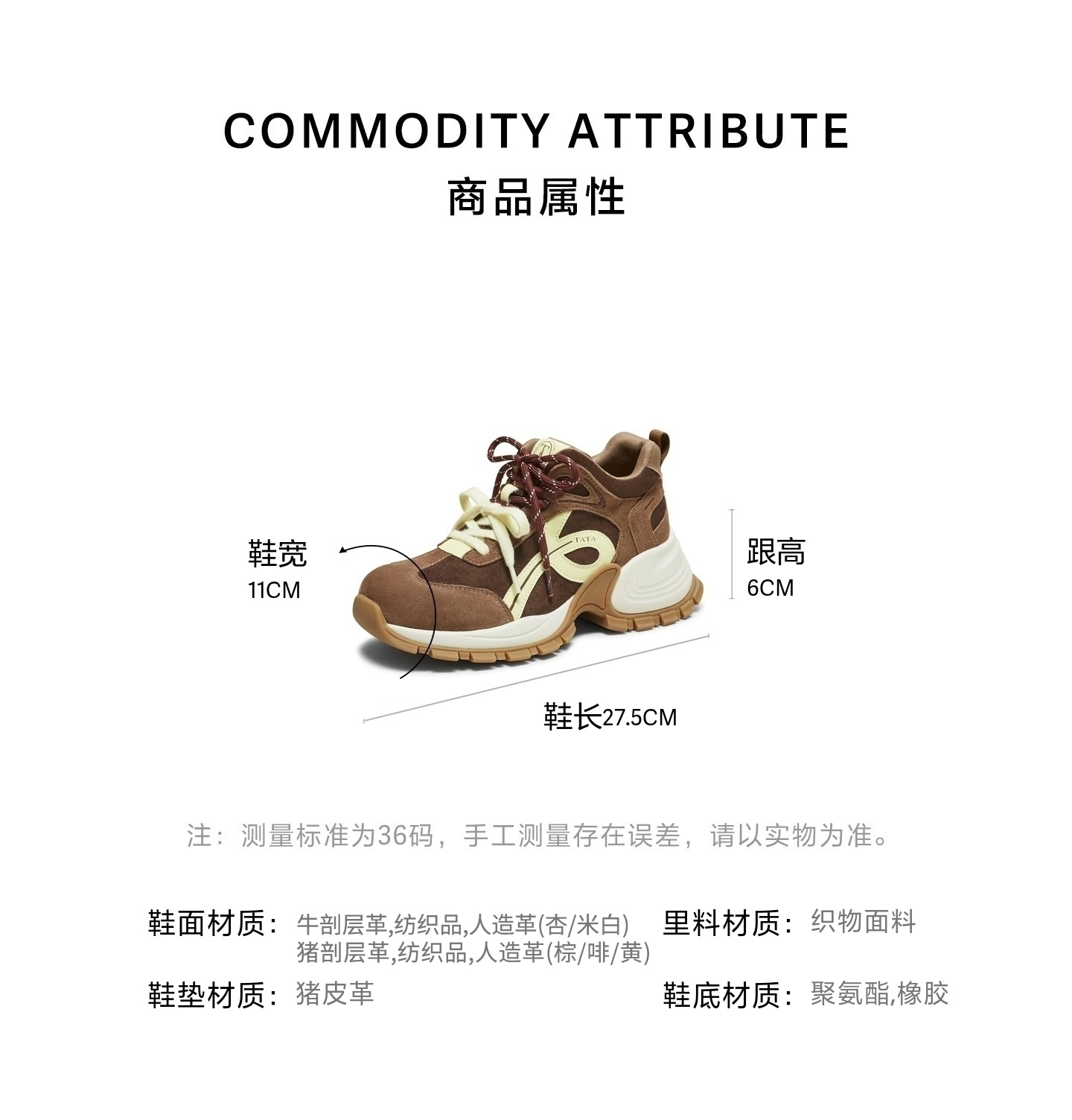| 鞋跟形状:厚底 | 参考鞋长(女):27.5CM | 流行元素:拼色 | 参考鞋宽(女):11CM | 风格:休闲 |