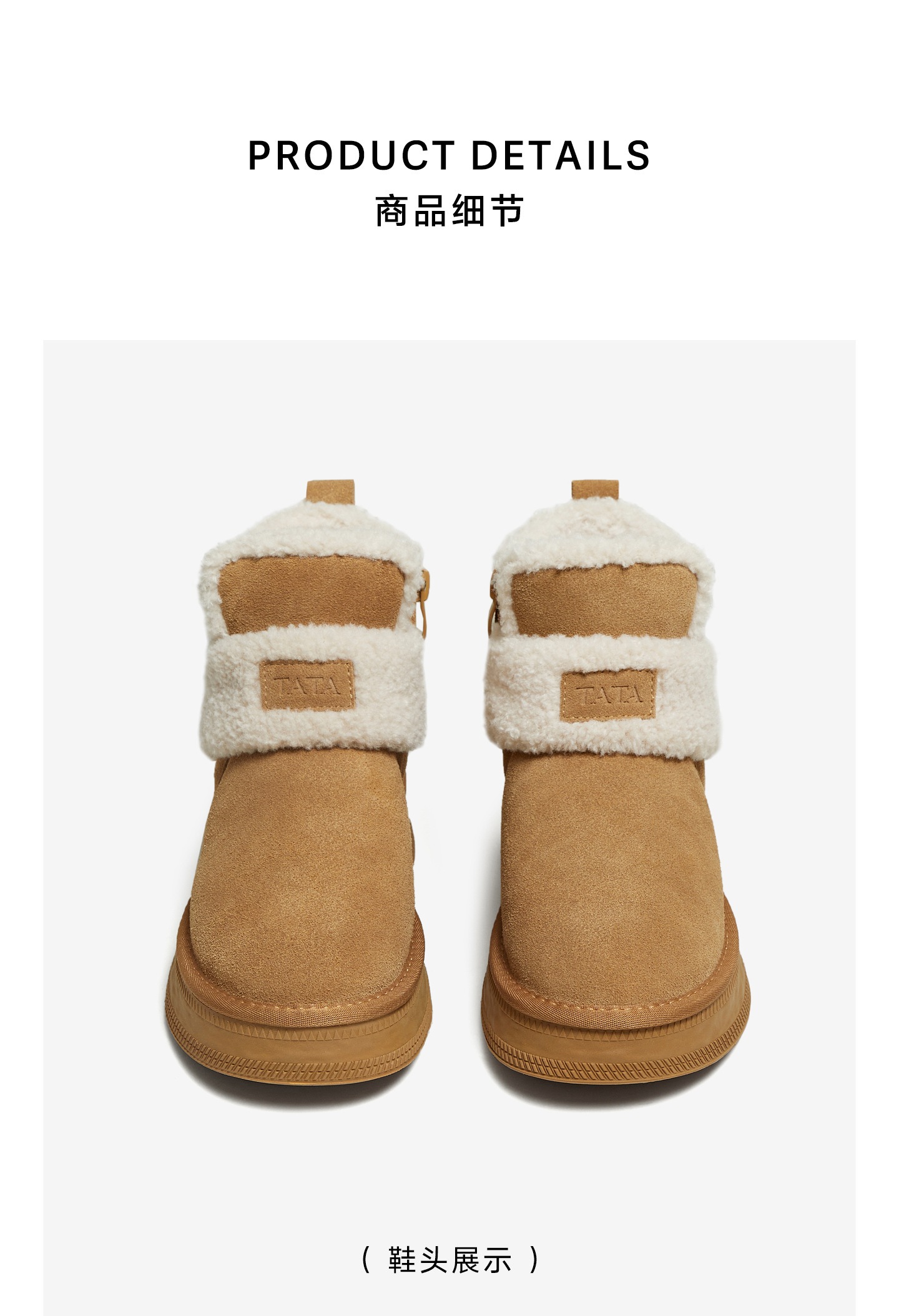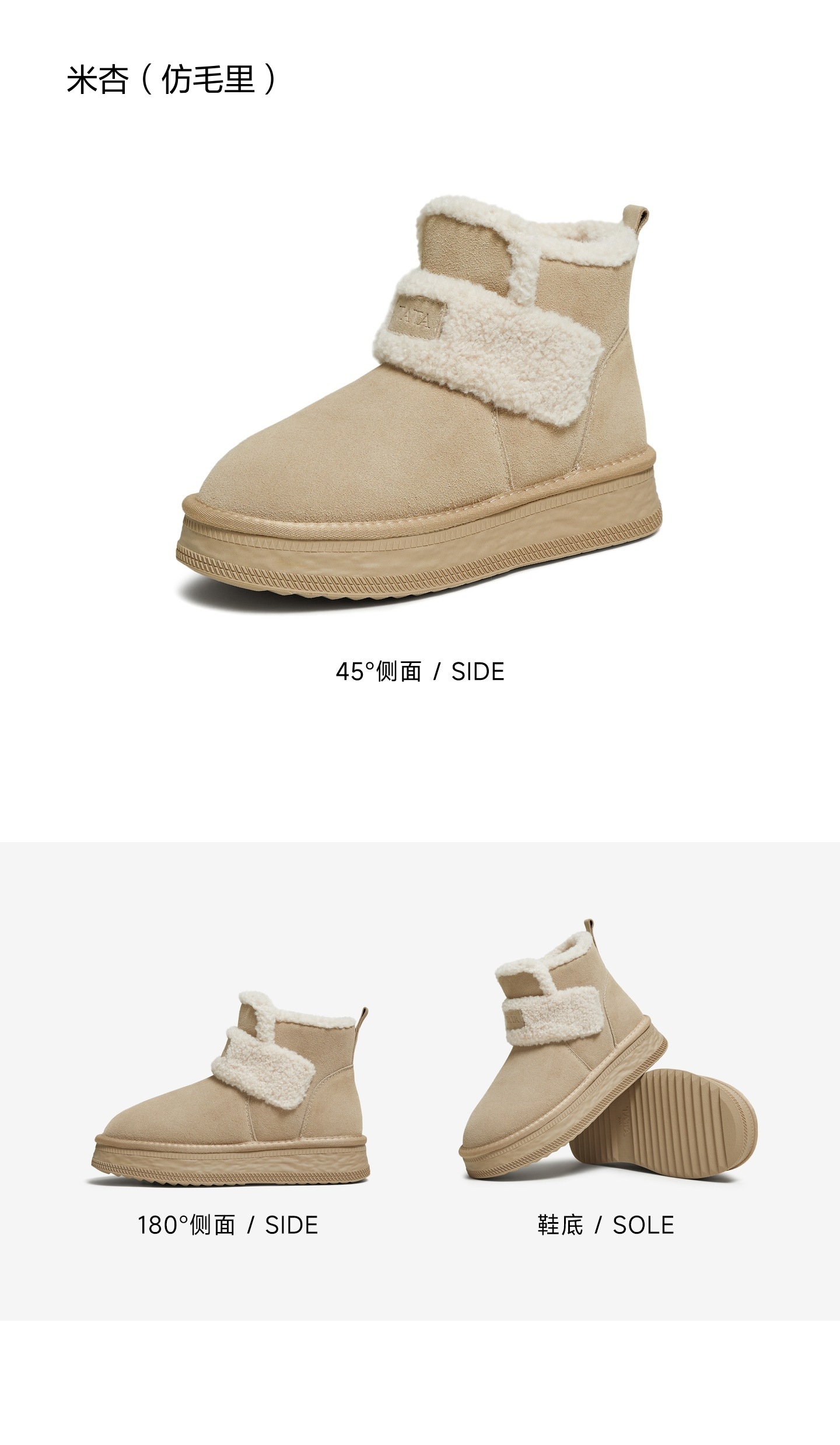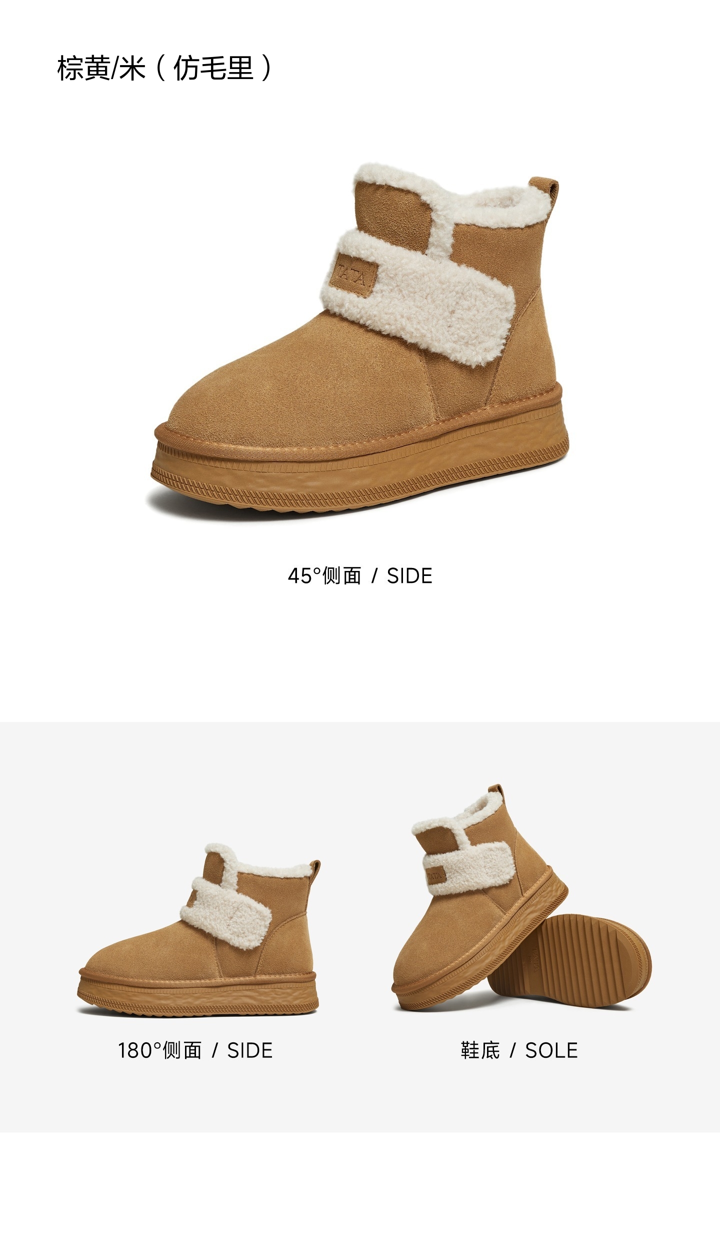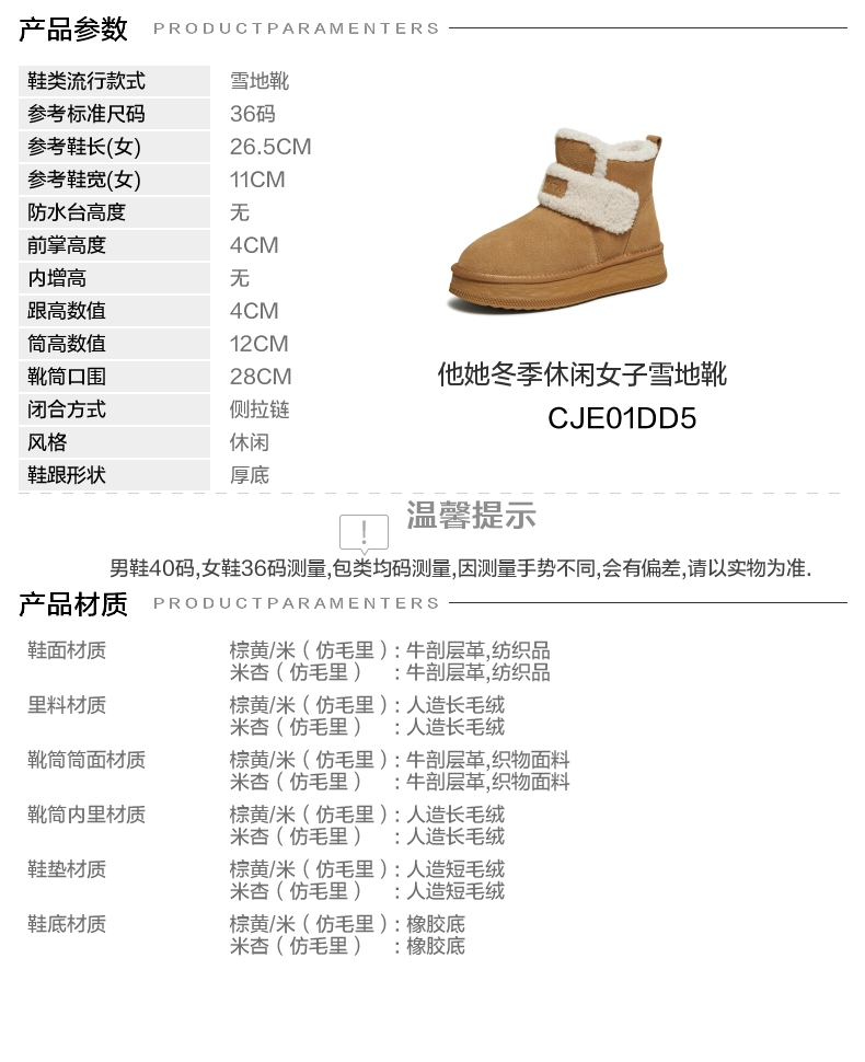 | 帮面材质:织物牛剖层革 | 配跟:无 | 靴筒口围:28CM | 上市时间:2025年冬季 | 鞋类流行款式:雪地靴 |