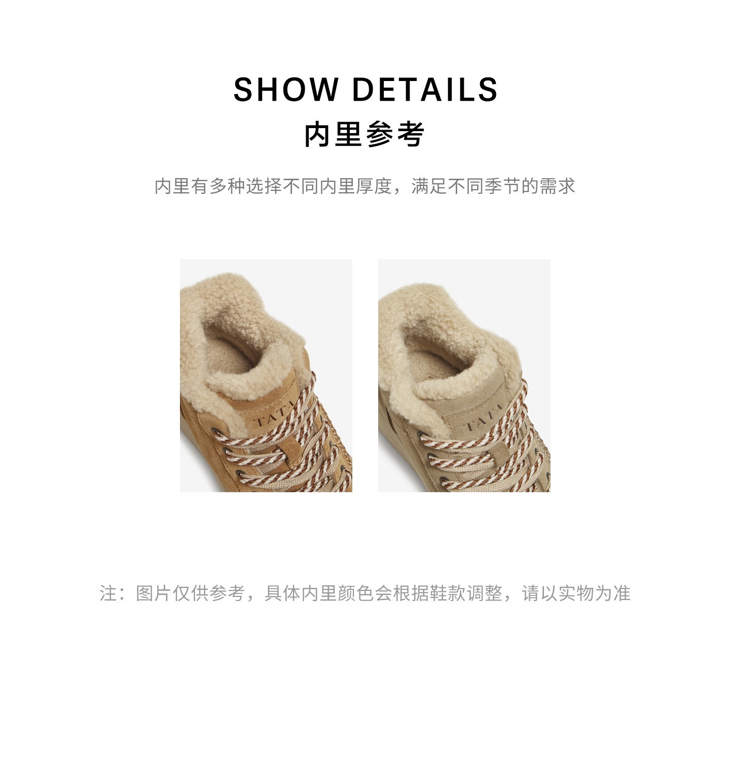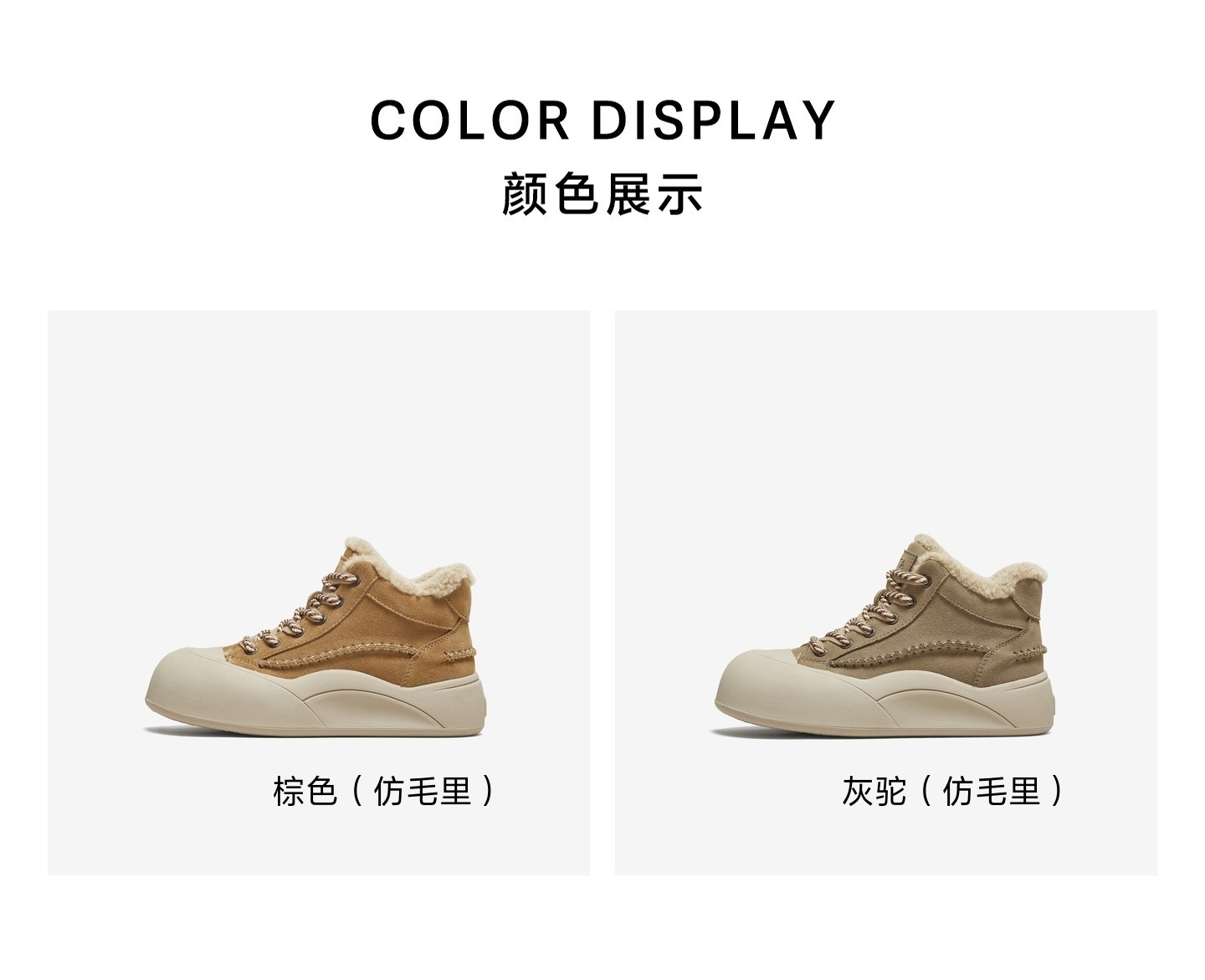 | 鞋底材质:橡胶底 | 靴筒内里材质:人造长毛绒 | 内增高:无 | 鞋面材质:牛剖层革 | 闭合方式:系带 |