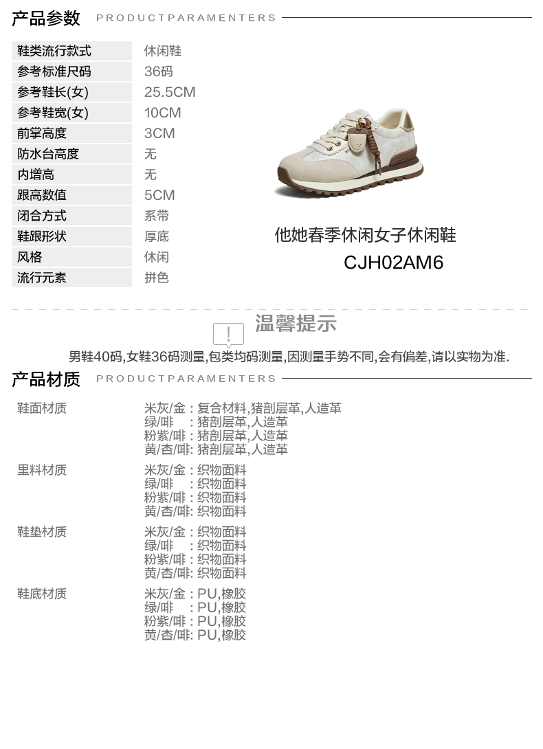 | 鞋跟形状:厚底 | 参考鞋长(女):25.5CM | 流行元素:拼色 | 参考鞋宽(女):10CM | 风格:休闲 |