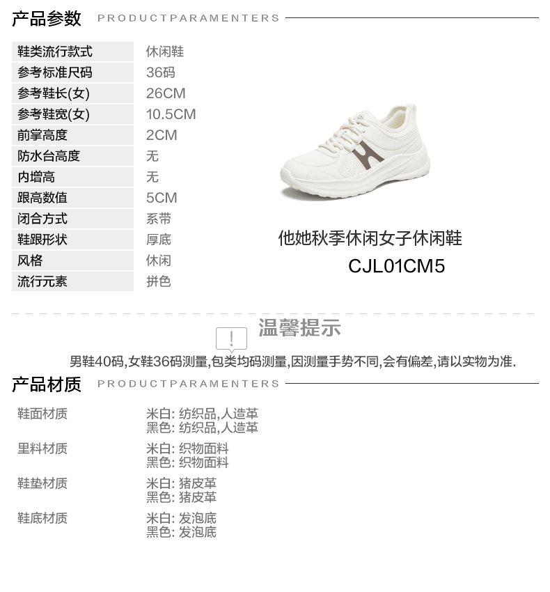| 鞋跟形状:厚底 | 鞋面材质:纺织品人造革 | 流行元素:拼色 | 参考鞋长(女):26CM | 参考鞋宽(女):10.5CM |