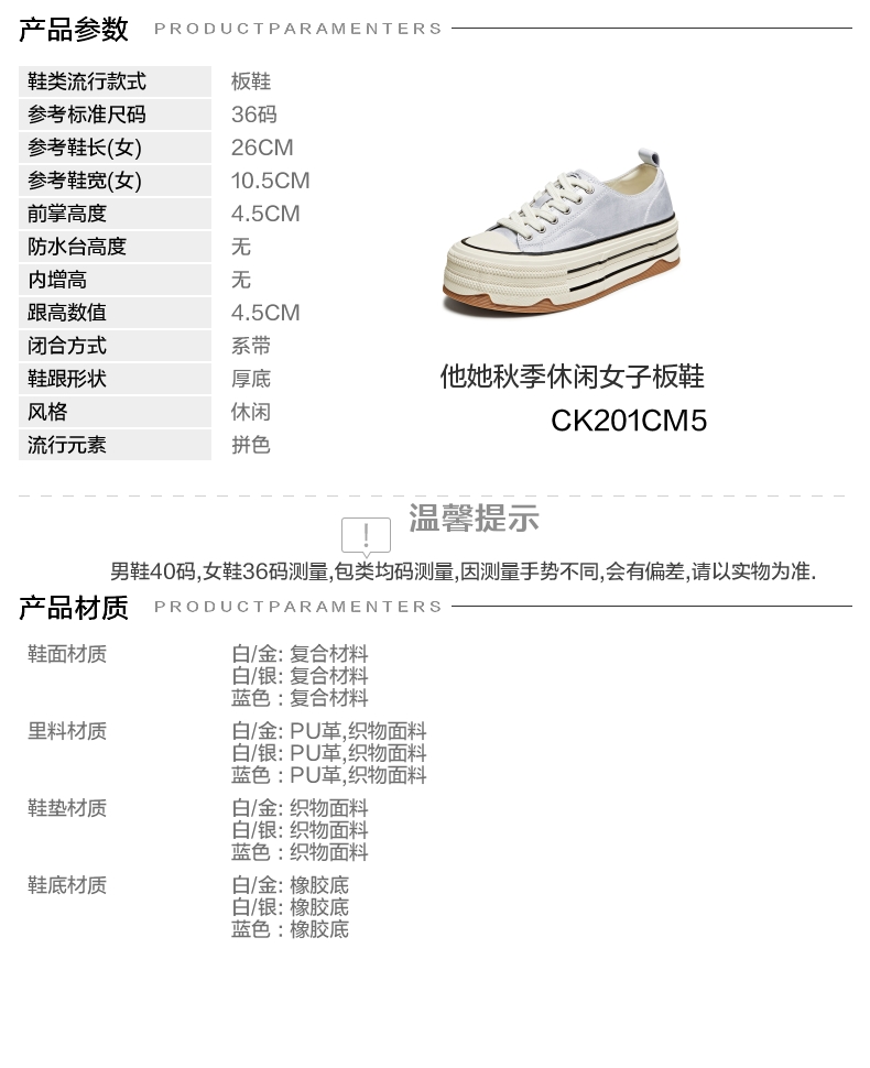 | 鞋跟形状:厚底 | 参考鞋长(女):26CM | 流行元素:拼色 | 参考鞋宽(女):10.5CM | 风格:休闲 |