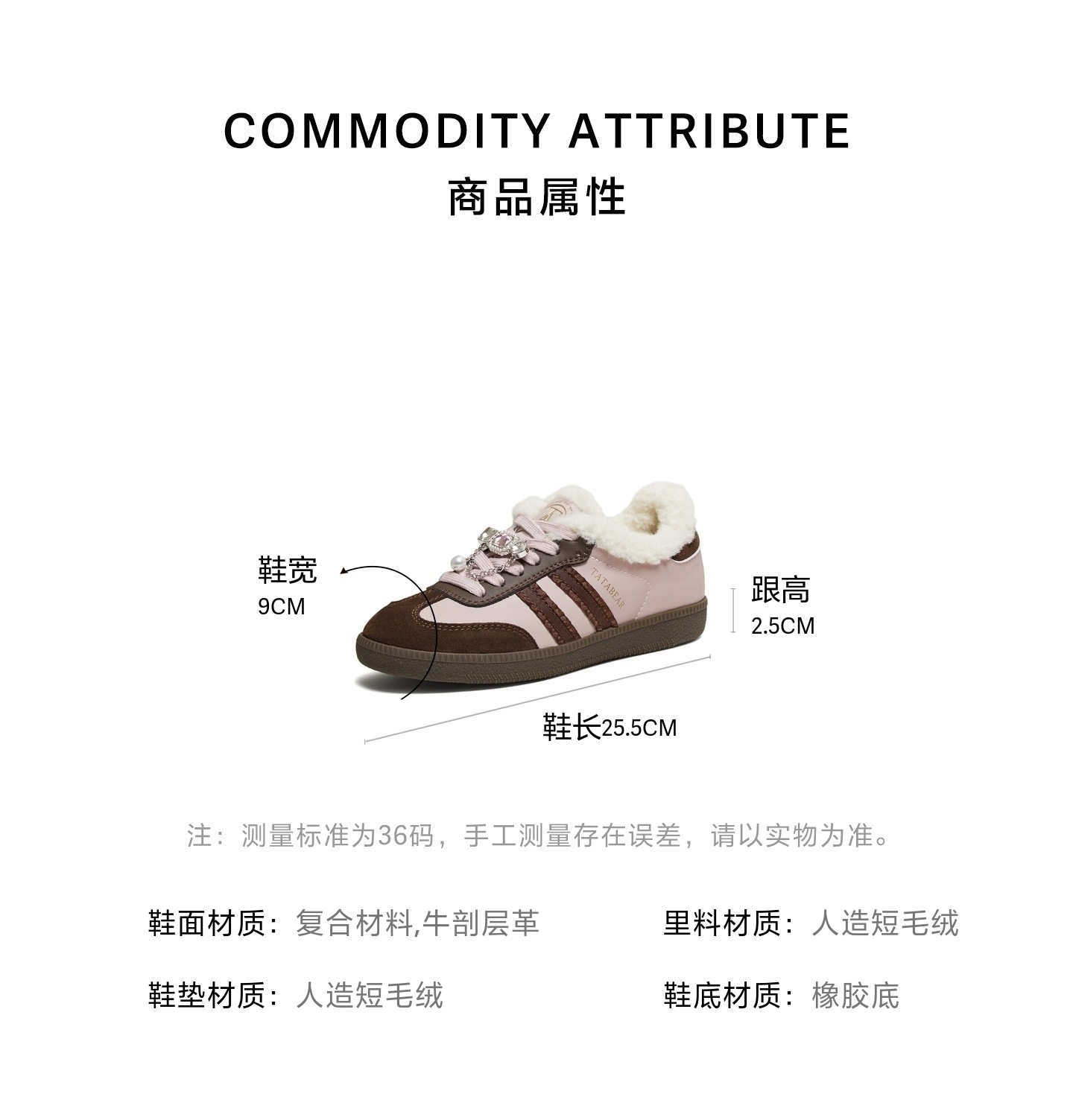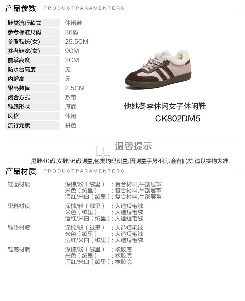 | 色系:棕色 | 跟高数值:2.5CM | 适用人群:女子 | 性别:女子 | 里料材质:人造短毛绒 |