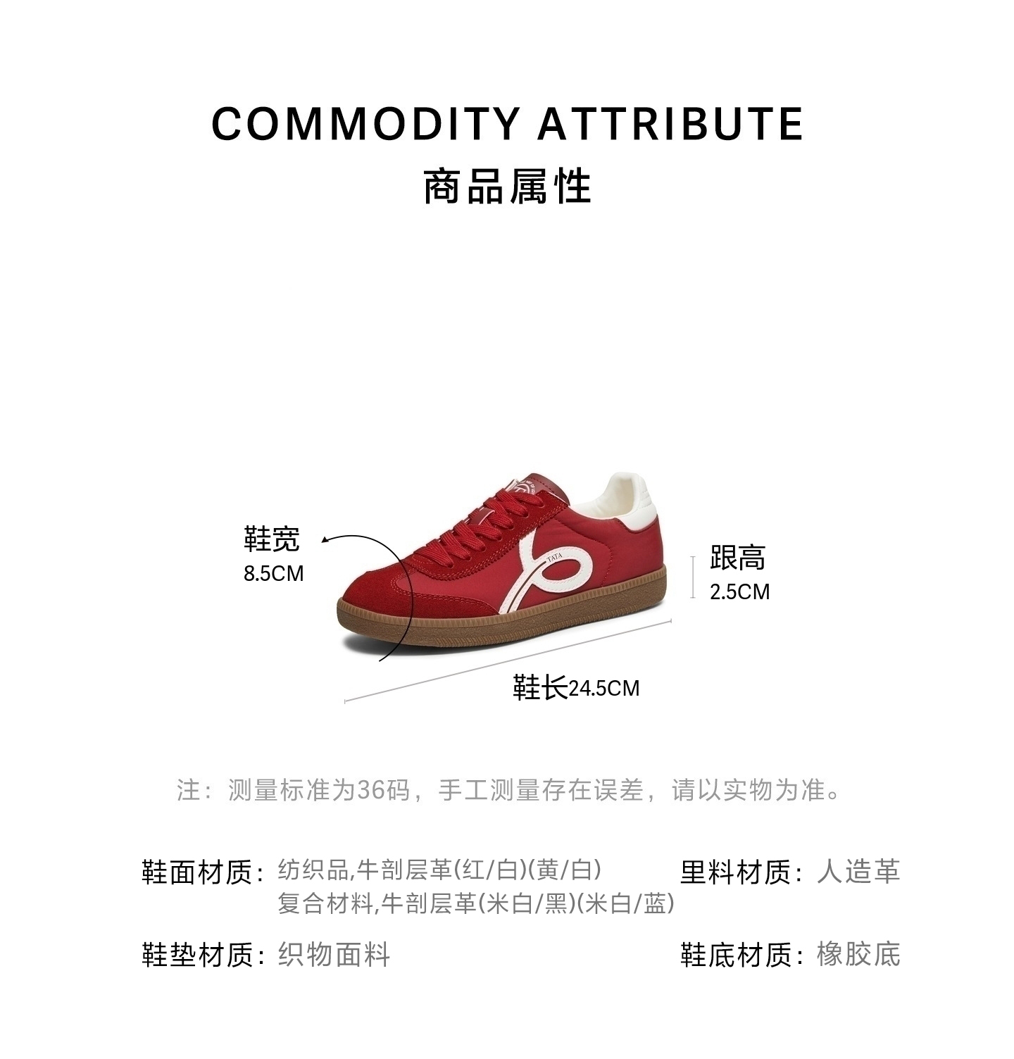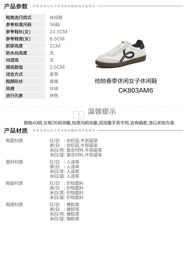 | 鞋跟形状:厚底 | 参考鞋长(女):24.5CM | 流行元素:拼色 | 参考鞋宽(女):8.5CM | 风格:休闲 |