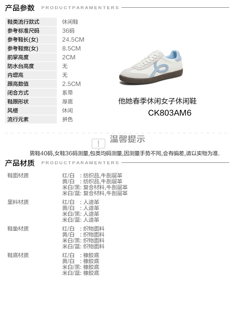 | 鞋跟形状:厚底 | 参考鞋长(女):24.5CM | 流行元素:拼色 | 参考鞋宽(女):8.5CM | 风格:休闲 |