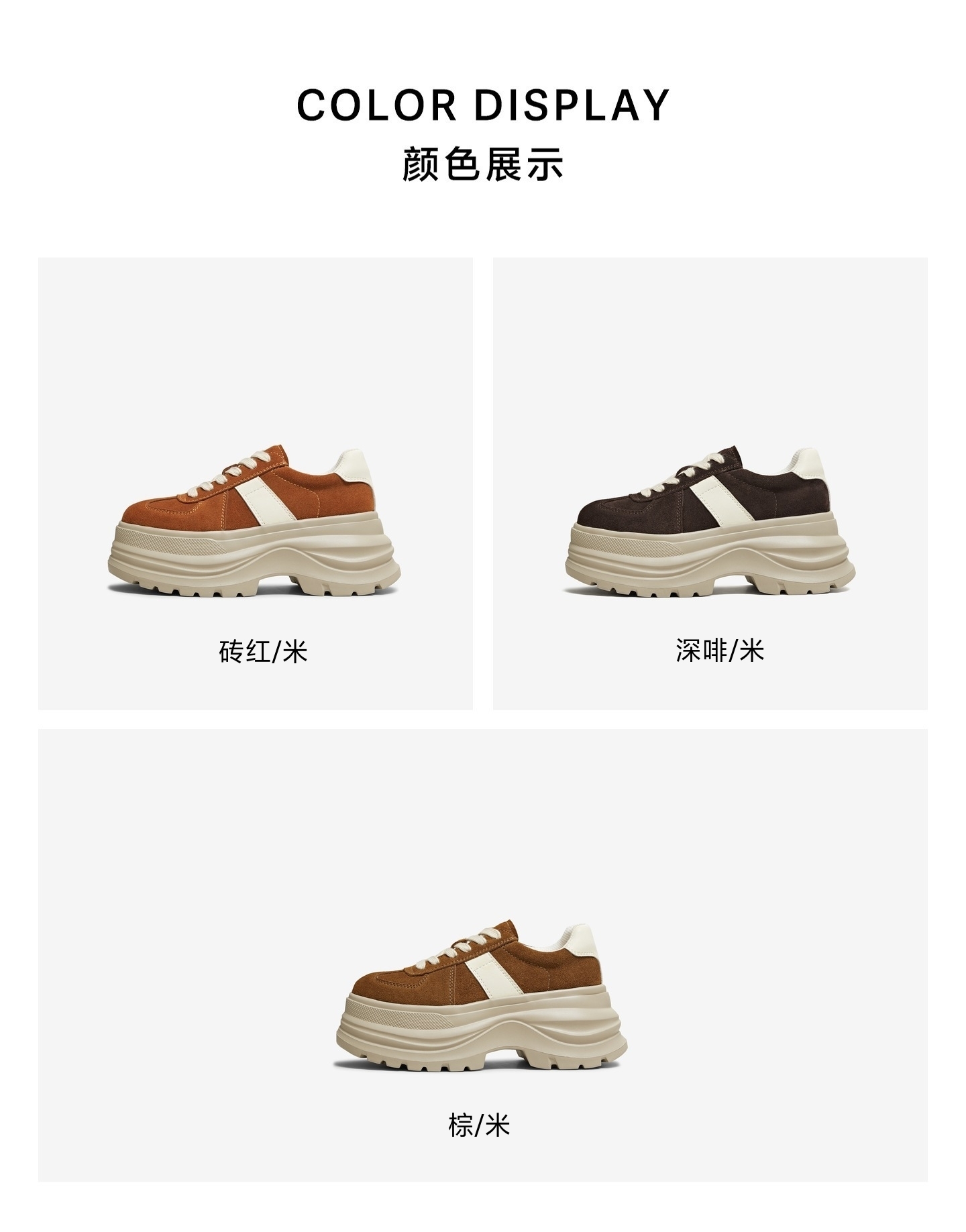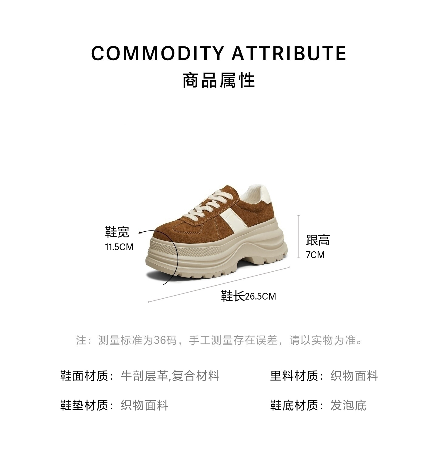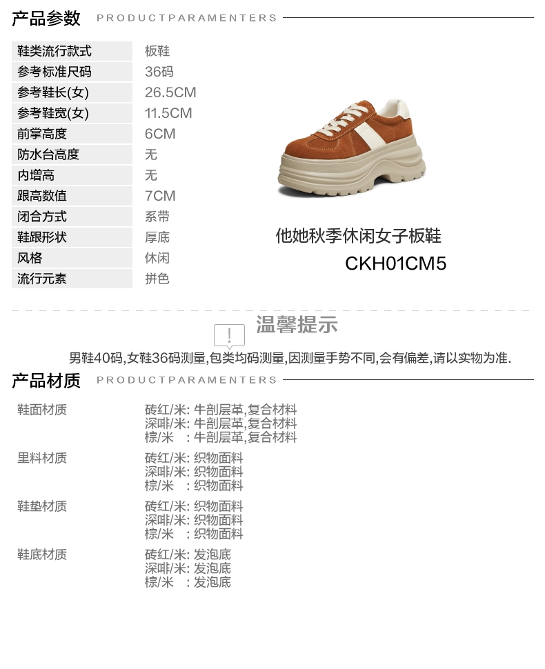 | 鞋跟形状:厚底 | 参考鞋长(女):26.5CM | 流行元素:拼色 | 参考鞋宽(女):11.5CM | 风格:休闲 |
