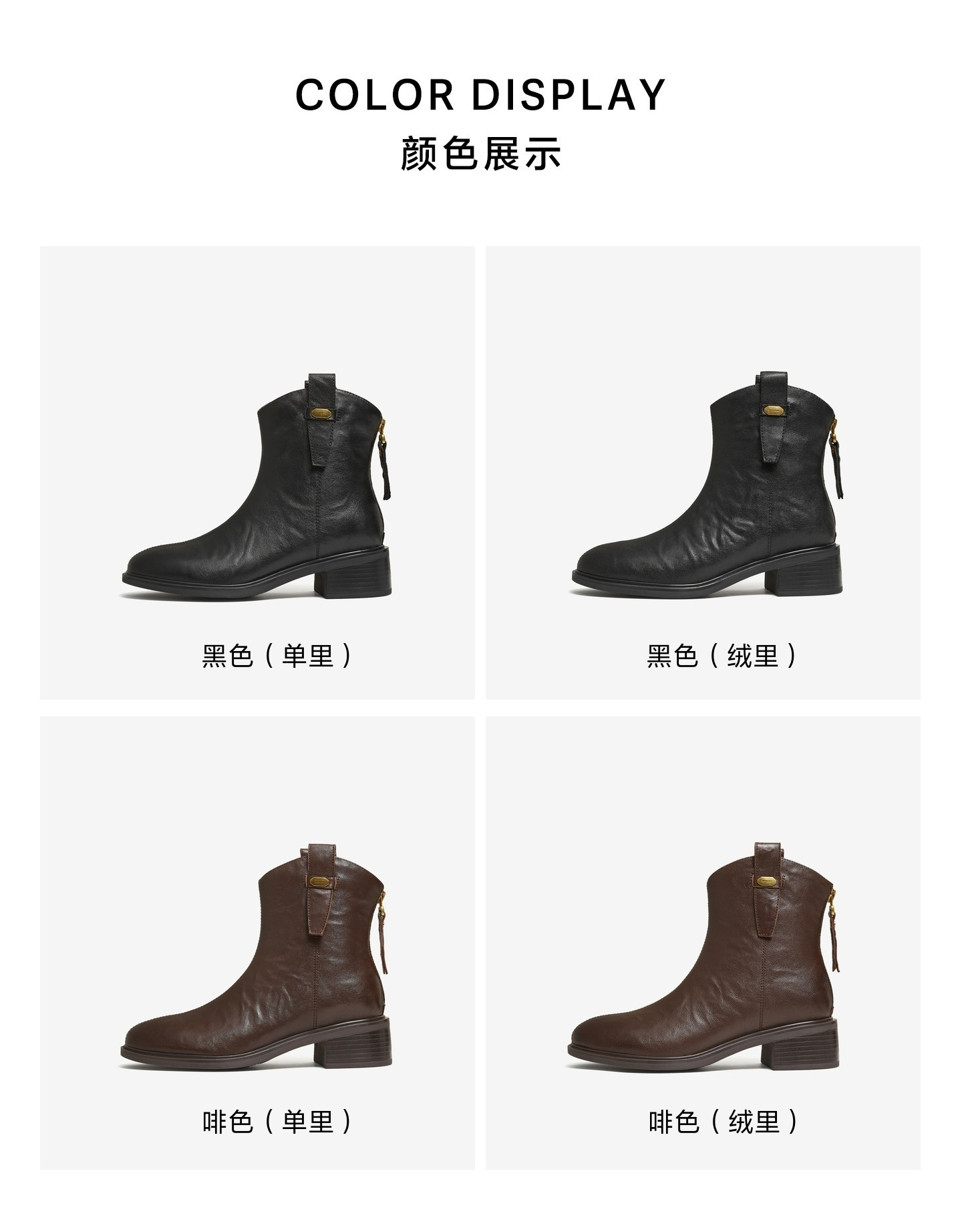 | 鞋底材质:橡胶底 | 靴筒内里材质:猪皮革织物面料 | 内增高:无 | 鞋面材质:羊皮革 | 闭合方式:后拉链 |