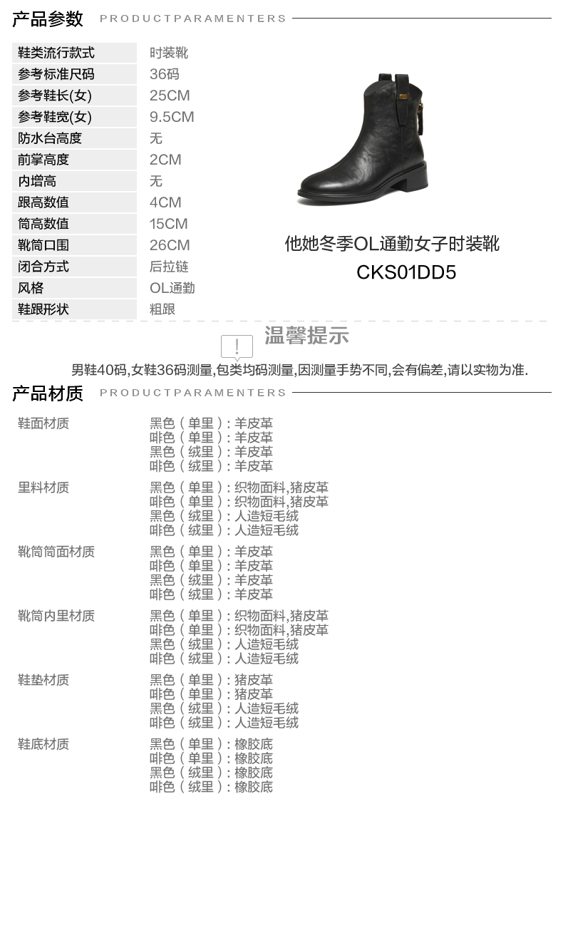 | 参考鞋宽(女):9.5CM | 风格:OL通勤 | 色系:黑色 | 跟高数值:4CM | 筒高数值:15CM |